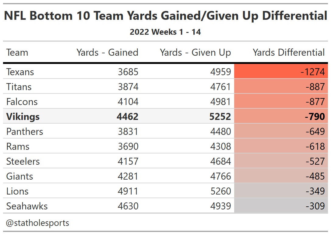The problem with the Vikings is that they are running out of victims dumb enough to be able to con into pissing games away at the end. Without that, they're just the only 10-3 team in NFL history with a negative point differential as shown by the graph above. But it's not just the point differential - it's yardage too. I tracked all teams difference in yards gained on offense vs given up on defense below. The Vikings find themselves at -790 which is fourth worst. Here's the bottom ten teams: