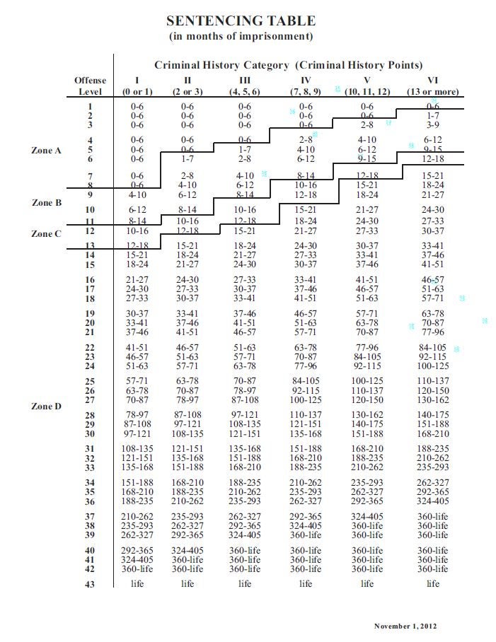 But first you need to calculate the offenses he's committed through the charging guidelines and offenses for fraud. If you notice on the chart the number in bold to the far left is the amount calculated through various things that add up points wise from the below offense levels.