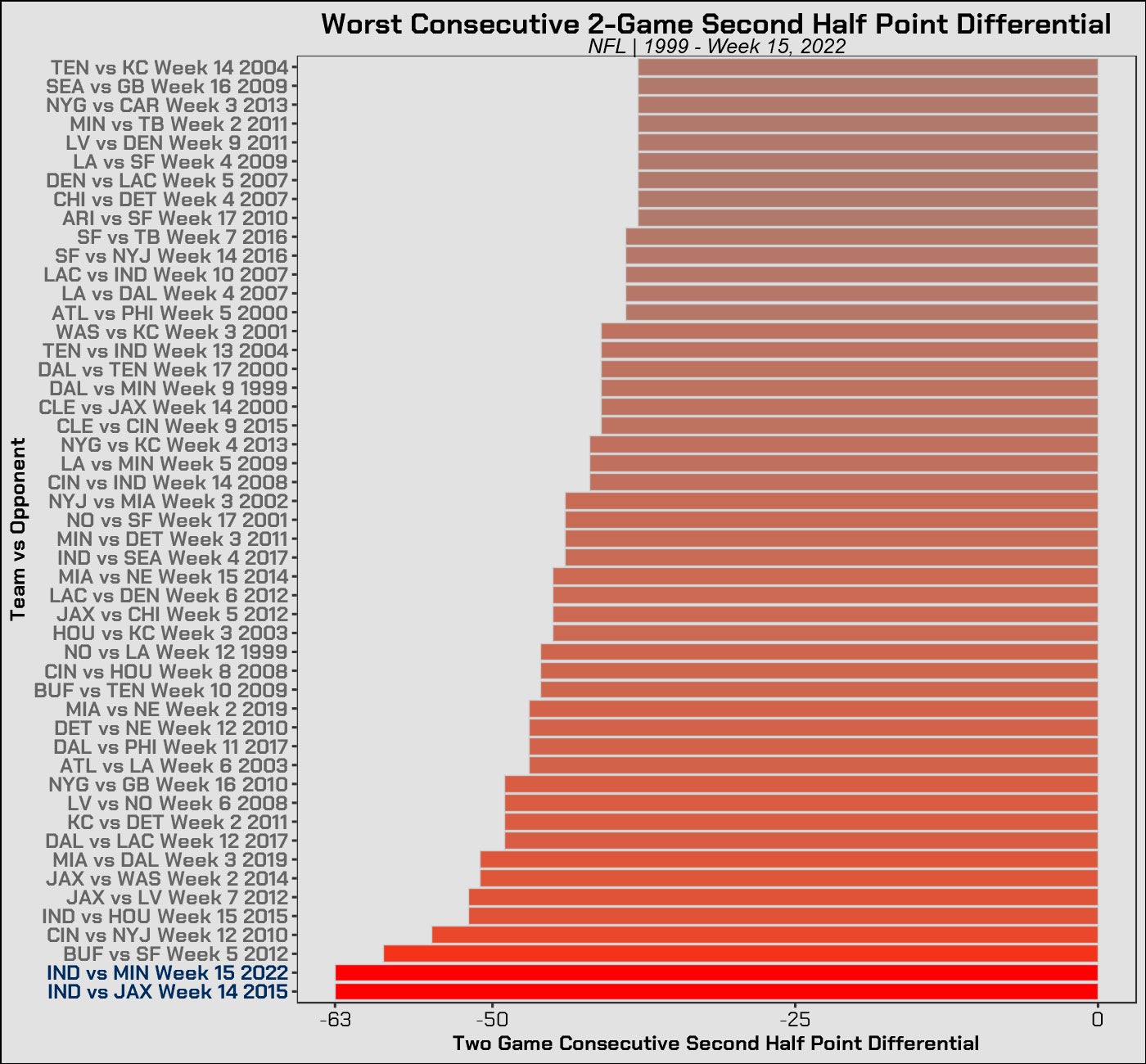 Sad Stat #1: The Colts second half point differential for the past two second halves (-63) is tied for worst since at least 1999 with… the Indianapolis Colts
