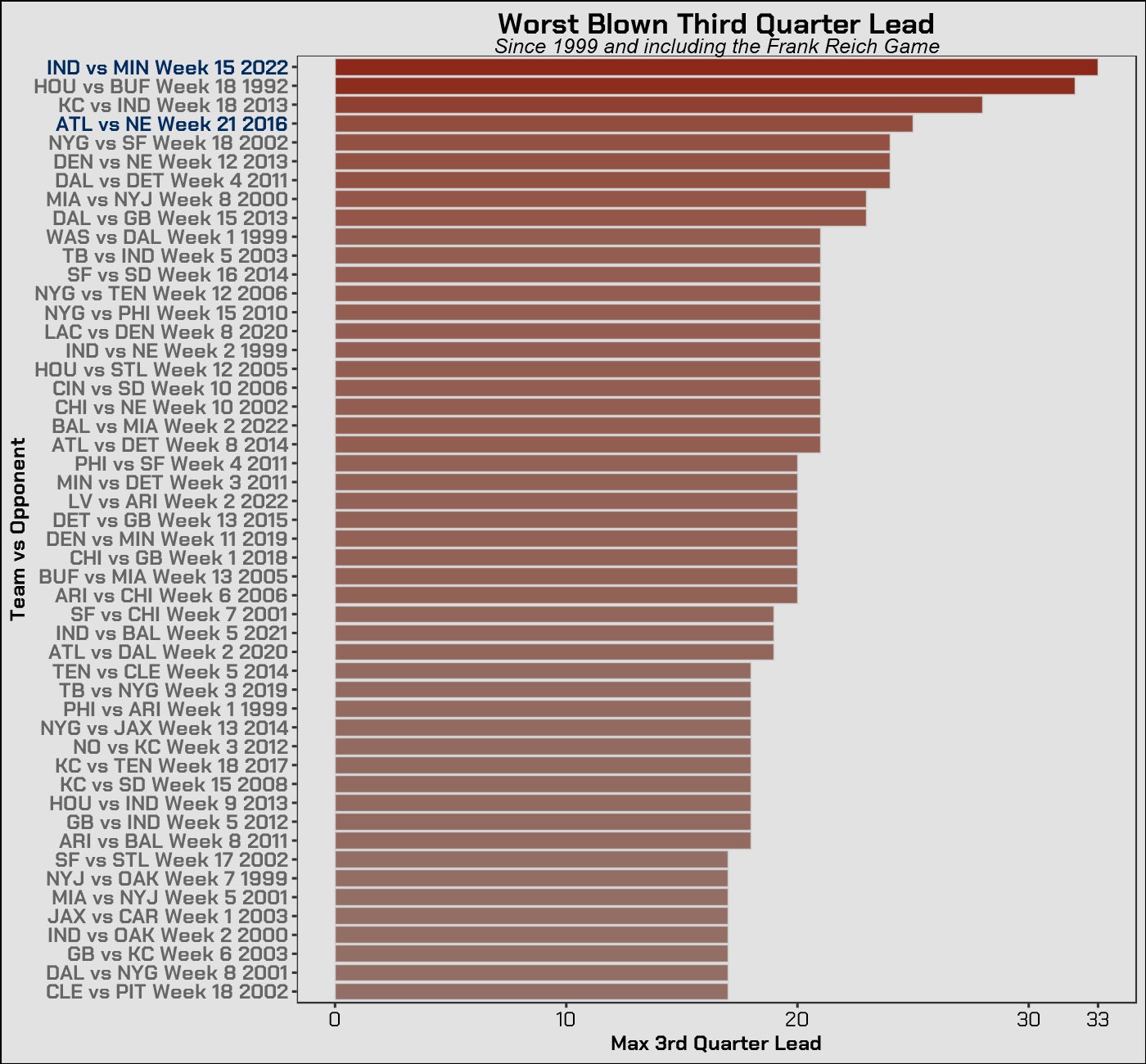 We've all heard this by now I guess but it's still fun to see. This is still just games from 1999 on except I cherry-picked the famous 1992 Houston / Buffalo Frank Reich game. Pretty brutal that four out of the top-five were playoff games with losing quarterbacks that never won a Super Bowl in Matt Ryan, Warren Moon, Alex Smith, Math Ryan, and Kerry Collins.