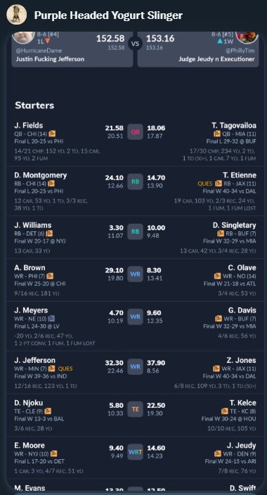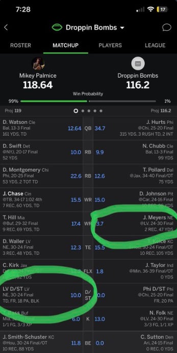 But… What if? What if there was a worse bad beat? What if all the above happened except instead the guy with Jakobi Meyers was up by ten points instead of three? And what if all other players on each team played except for one little tiny itsy bitsy exception: the opponent also had the Raiders DST?