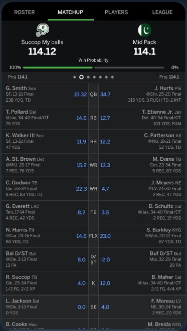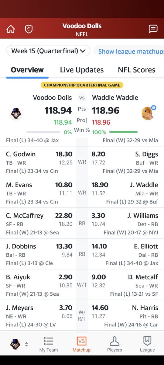 Welcome the fantasy football playoffs, baby! Oh, you have a three-point lead (but less than four-points) going into the last play of the game with all players on both teams in the clubhouse except Jakobi??