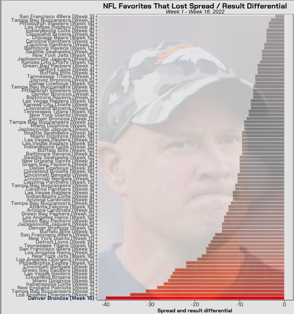 It's entirely possible this might have had something to do with Nathaniel Hackett's firing. Before Week 16, the Chargers getting blown out by the Jaguars in Week 3 was the worst upset of the season. I covered in Sad Stats Week 7 that the Broncos had the worst implied score across the first seven weeks ever which basically means that their offense was so bad - not even Vegas could predict how bad they would continue to be. And giving up 51 to a team with a quarterback who's been on the team for two weeks was the last straw for easily the most embarrassing "Super Bowl hopeful" team ever.