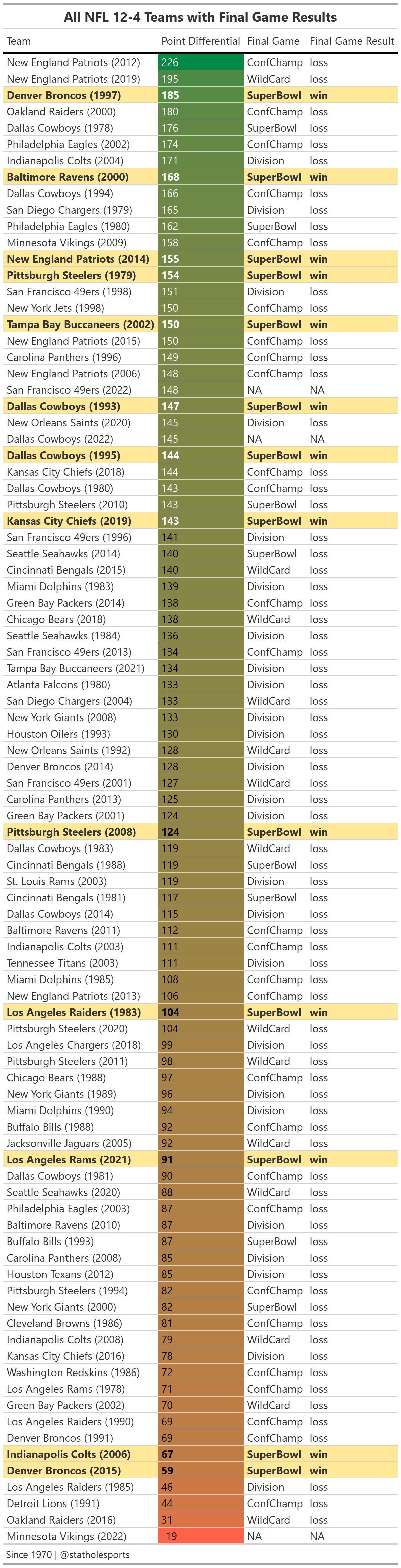 Focusing on 2022 alone - we have three 12-4 teams. They 49ers (+148), the Cowboys (+145) and the Vikings (-19) pending the 12-3 Bills (+157) MNF matchup. But the moral here is that unless your quarterback was literally Peyton Manning, no 12-4 team ever won a Super bowl with a point differential of less than 90. The Vikings are at -19. Oh yeah - and they have Kirk Cousins. Not ideal.