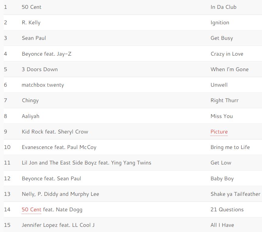 In the top 15 songs from 03' you have Jay-Z and Beyonce, Sean Paul, Matchbox Twenty, Chingy, Kid Rock and Cheryl Crow, Evanescence, Lil Jon and the Ying Yang Twins (who are actually not twins, total false advertising), and J-Lo and LL Cool J. This was one of the last years where you can find alternative music hovering near the top of the charts.