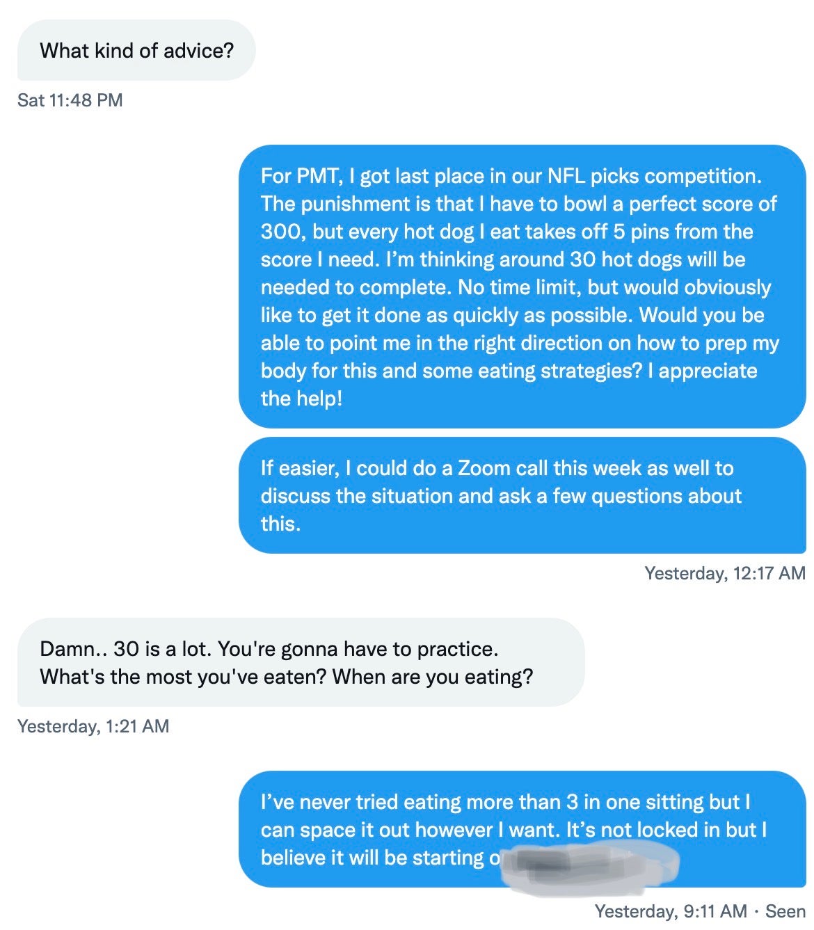 Strategy No. 2) The eating portion of this challenge will definitely be the toughest. I think a realistic score for me to bowl is 150 (if I am not sore), which would mean 30 hot dogs. That's an insane number (especially as someone with a VERY sensitive stomach), so without diving into it much, I'm hoping to be able to eat at least one hot dog per hour for 10 hours. Is that possible? I have no idea. We'll see the type of dogs that we are working with, but I'm hoping it's doable. To help make this process easier, I reached out to a man who knows a thing or two about eating a lot of hot dogs in one sitting…