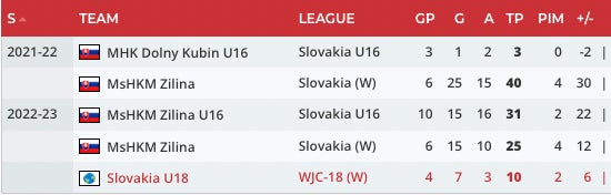 Just as a quick comparison here, Juraj Slafkovsky was the 1st overall pick in the 2022 NHL Draft. When he was 14-years-old he also played in that Slovakian U16 league. He had 54 points in 23 games. Nela Lopušanová is on pace for damn near 70 in the same amount of time.