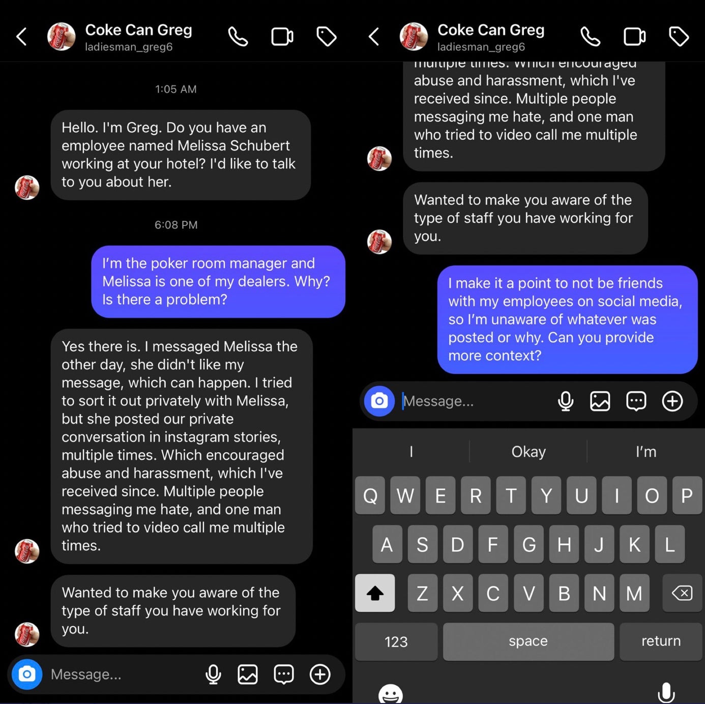 When his long-winded pleas resolve nothing and her Instagram stories remain, Greg takes things a step further and reaches out to another poker pro, Danielle Andersen, who he believes is Schubert's boss at her casino job. (Andersen has never met Schubert and I don't think either of them work at a casino.) Andersen gleefully relays her own convo with Greg back to Schubert, who continues to share.