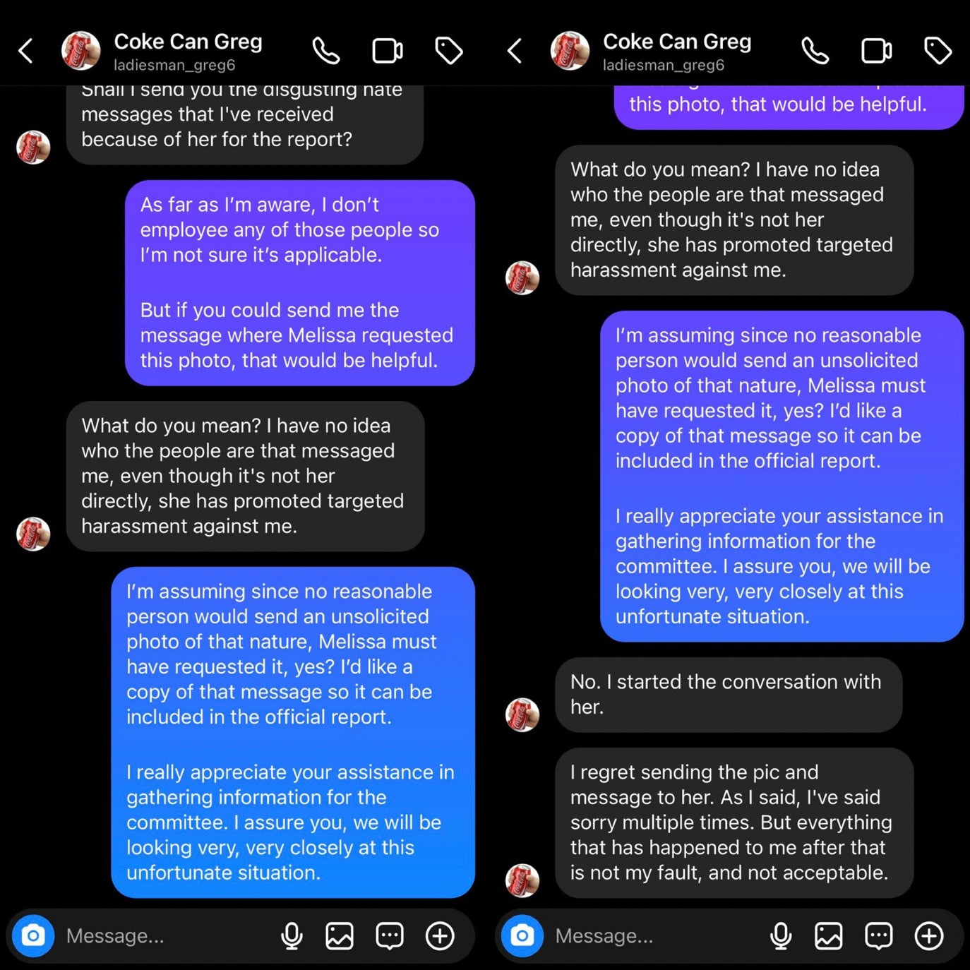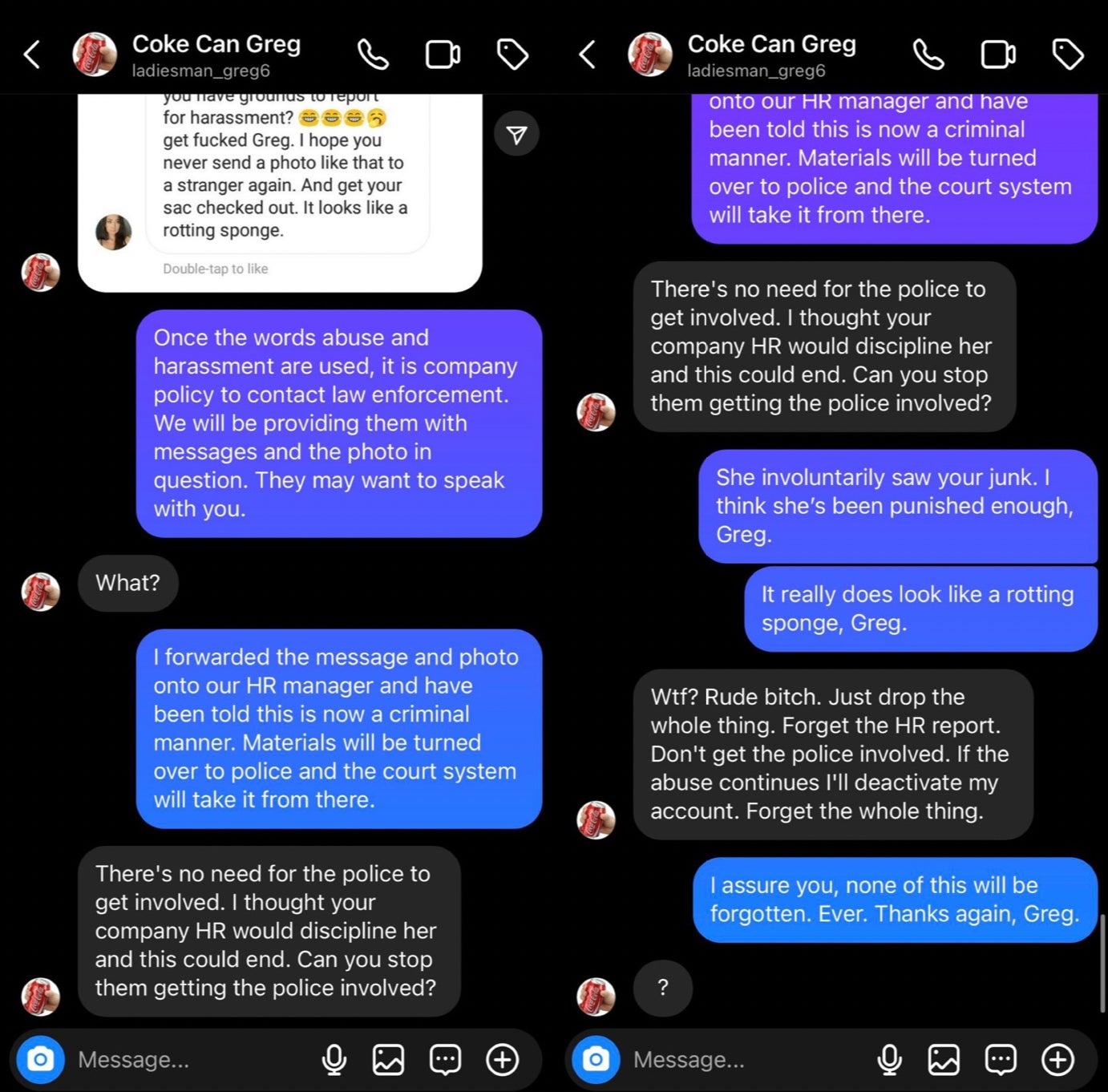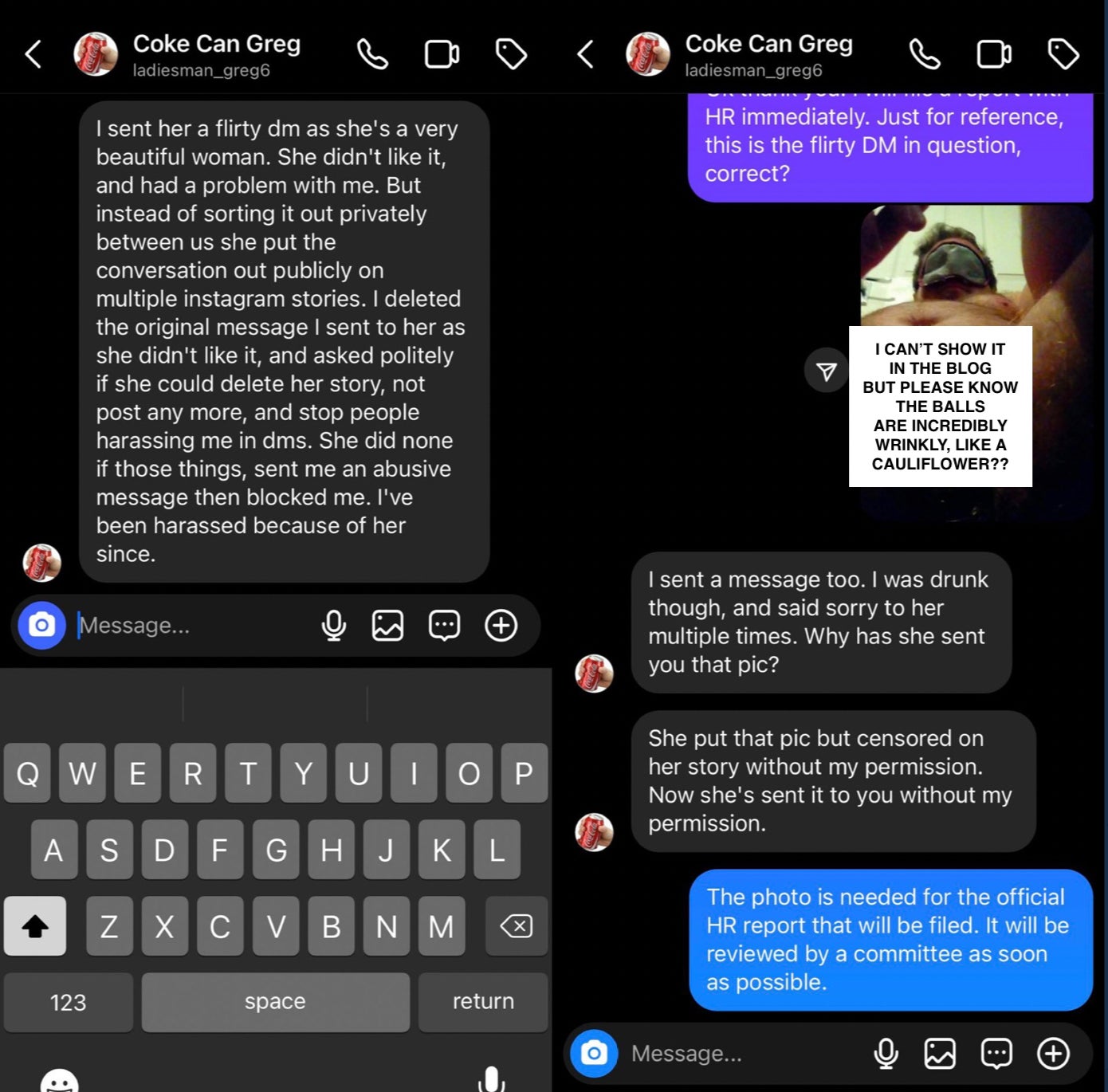 This is where the wheels really start to fall off for ol' Greg. When he sees that his unsolicited dick pic is now public and his genitals were referred to as an atrocity he flips out.