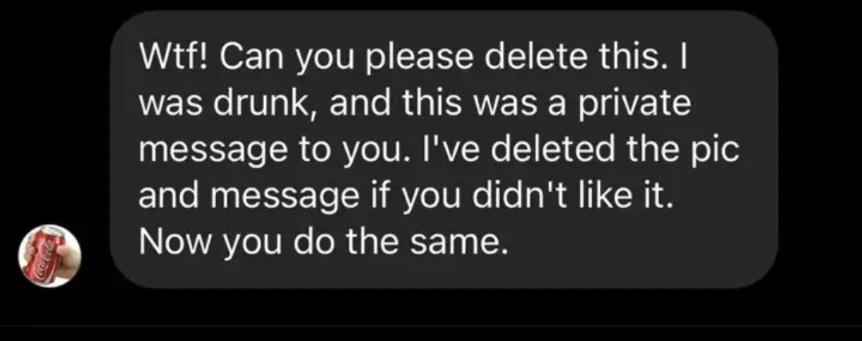 Now that's an ANGLE. Coke Can Greg didn't just send a traditional surprise dick pic, he sent the whole kit and caboodle. Not here to body shame, but you've got to give a little warning if you're gonna drop a swollen man-tiddy, cavernous belly button, tangled field of inner-leg hair & the entire frumunduh-bundle, and shot from below no less.