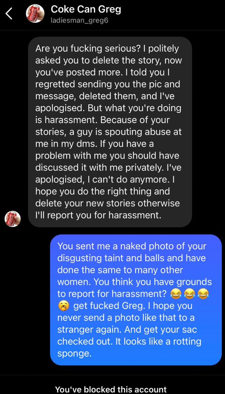 When she does not delete the harassment he sent, he flips to become the victim since he is now the one receiving abuse. He highlights his own politeness (leaving out the part where he dropped his messy cock n balls into her world) and says he hopes she does the right thing.
