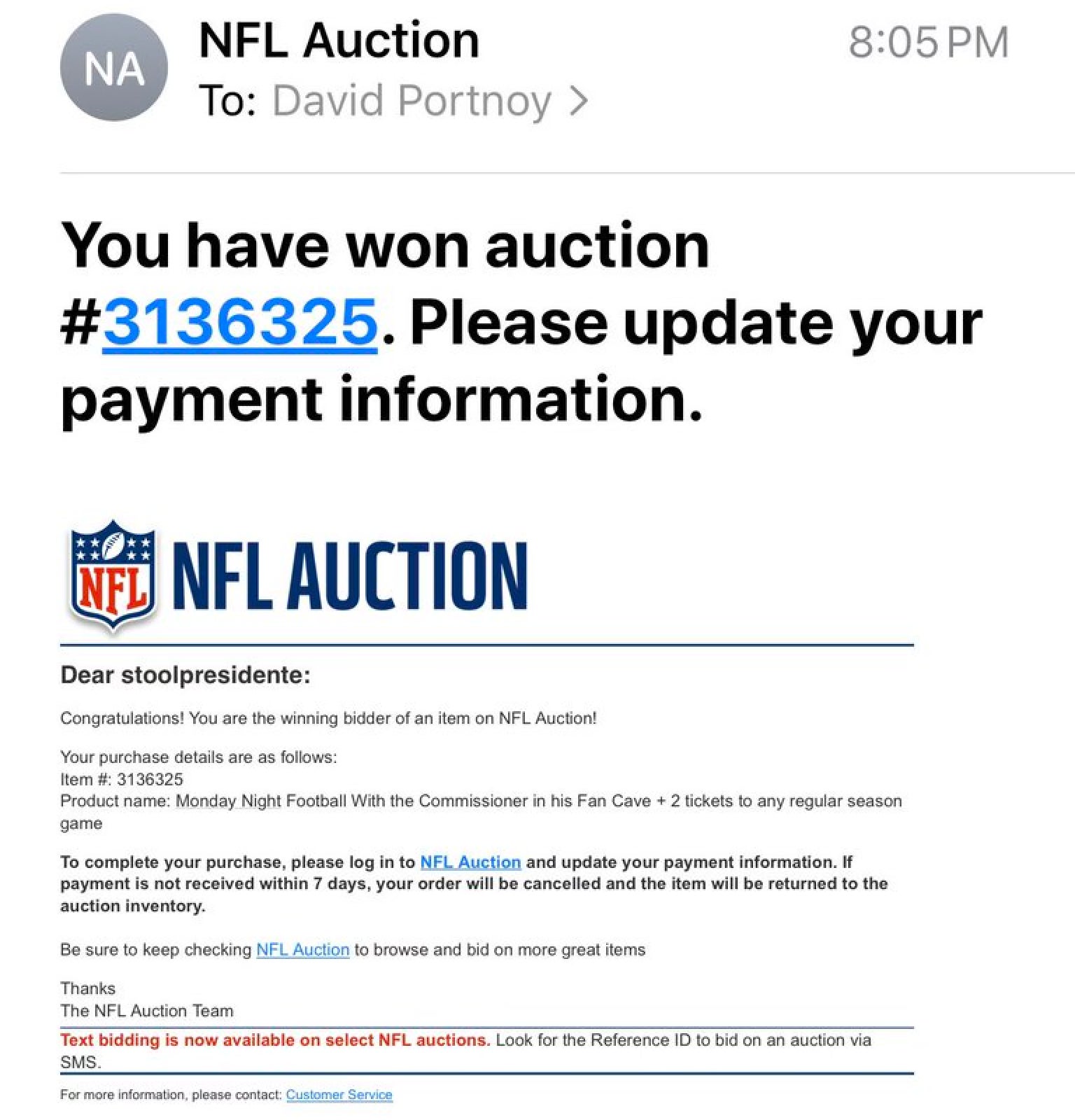 8. I Paid 250K To Win A Covid Auction To Watch Monday Night Football With Roger Goodell In His Mancave. The Prize Was Revoked By Roger Goodell. Nobody Got The Money For Charity