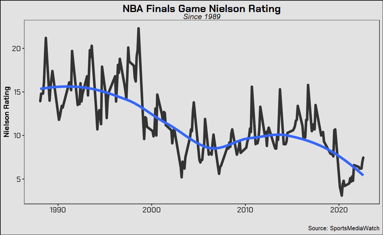 OK, final test result to go over. The overall health of the NBA's heart indicated by how many fans are watching. The EKG results below show all the Nielson ratings for every NBA finals game going back to the Bird era. It doesn't take an expert (like me) to see there are some serious abnormalities in this rhythm.