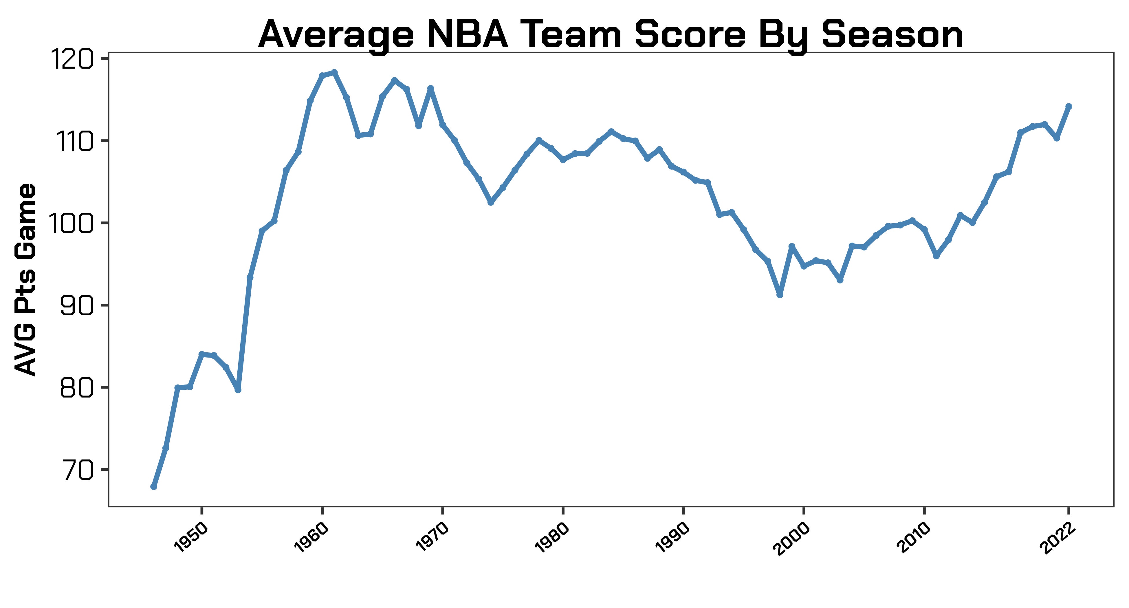 Here's the NBA blood pressure readings over the course of it's life expressed by average team score per game. Let's have a chat.