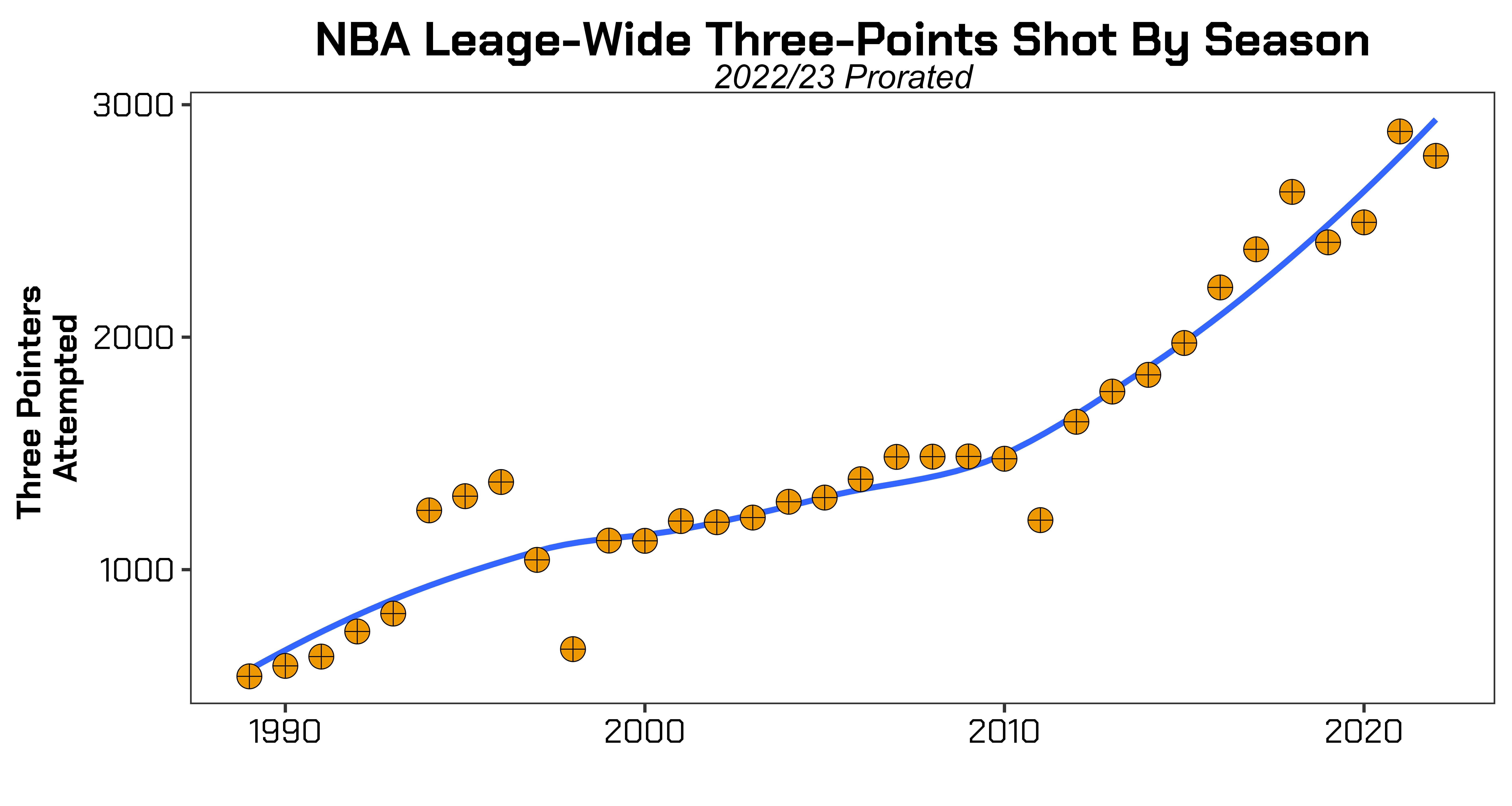 Move the three-point line back including along the baselines: This is similar to what Kirk Goldsberry recommends in Sprawlball. He thinks the straight line baseline three should be a full arc but I honestly just like the visual aesthetic of the straight line. Just move it back a bit and challenge players to be sure they're in bounds before attempting shots from one of the most common spots on the floor in 2023. Daryl Morey's idea is to make three pointers 2.5 points. As a blackjack player, I think this idea stinks. This is almost exactly mathematically equivalent to casinos changing 3/2 blackjack payouts to 6/5 (for us peasant min hand blackjack players). It just loses all the umph (see I'm not a total offense hater!).