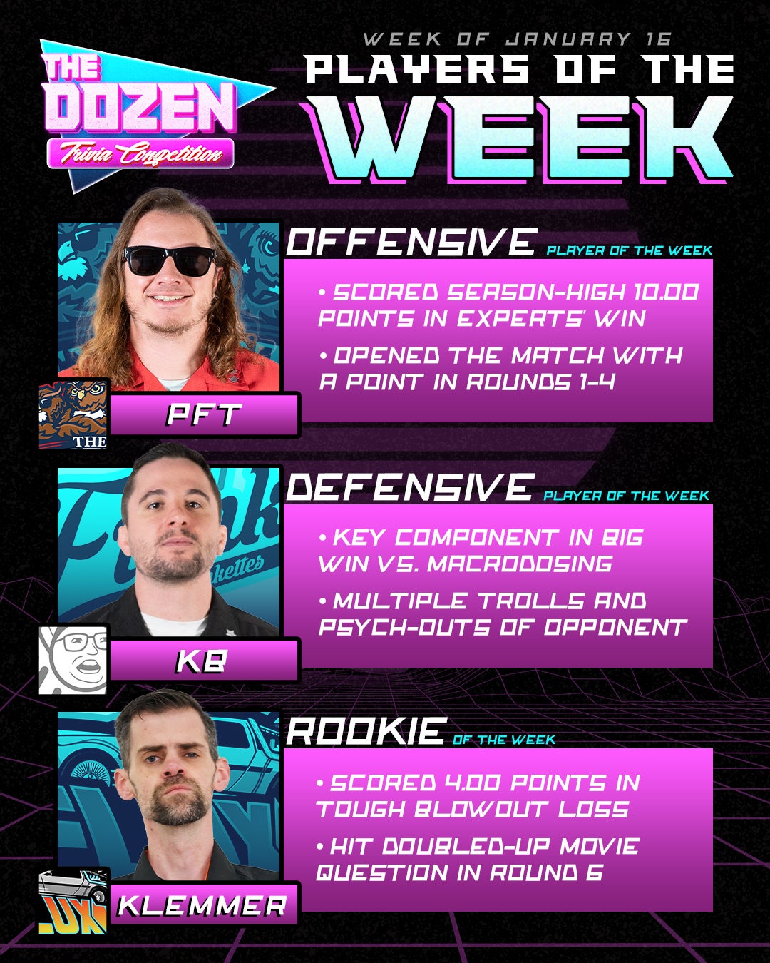 - PFT wins Offensive Player of the Week after a 10-point performance that now makes him The Experts leading scorer. Fran had held the title all season up until this point.