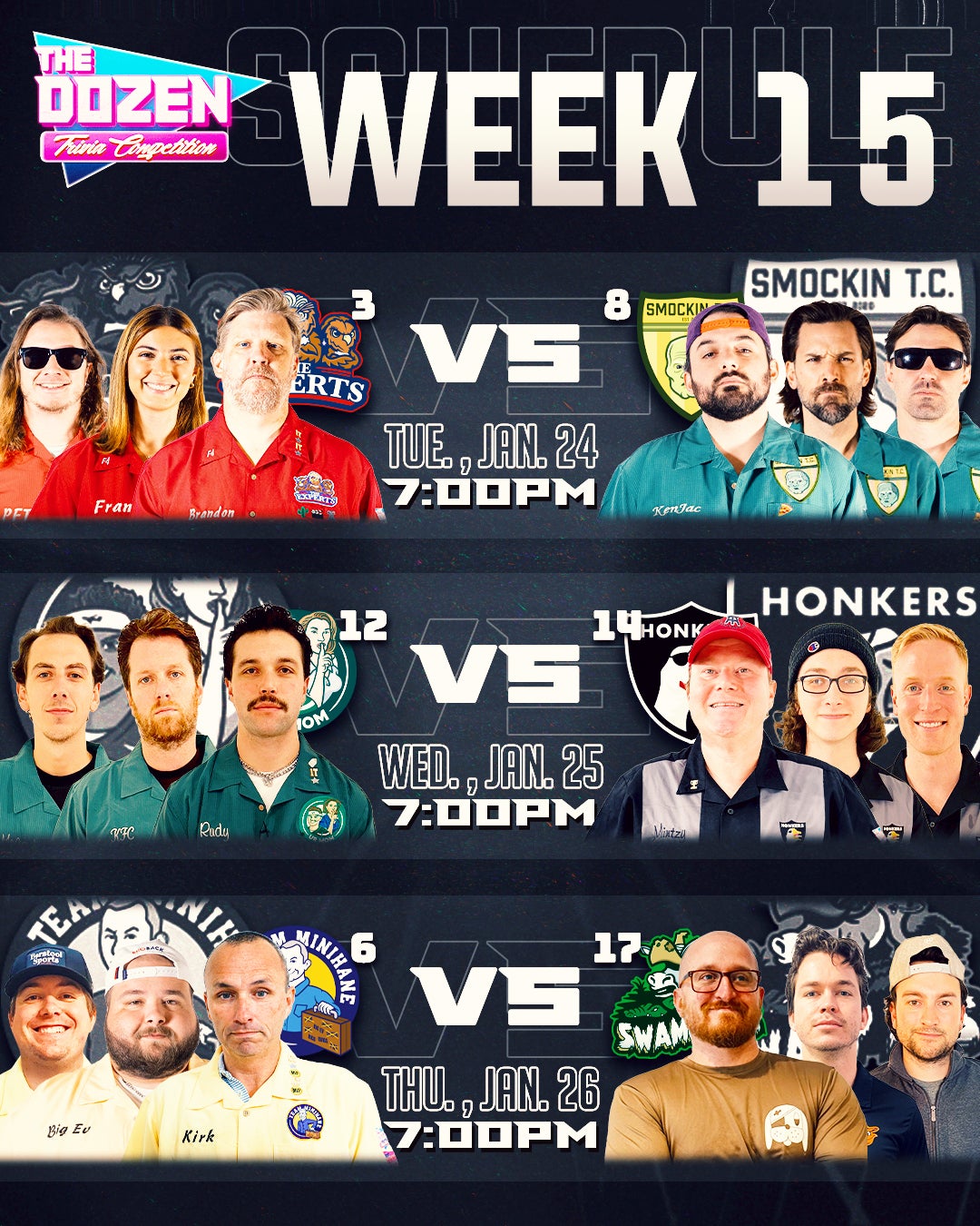 The Dozen Week 15 is here. We got a classic match-up between The Experts and Smockin. UrMom plays the Big Screamin’ Honkers for the first time since their debut match, except the roles/rankings are flipped. And then we have the former MVP taking on the potential ROY as Team Minihane faces Swamp Ass. Our correspondent Scoops L'Aguirre has the breakdown…