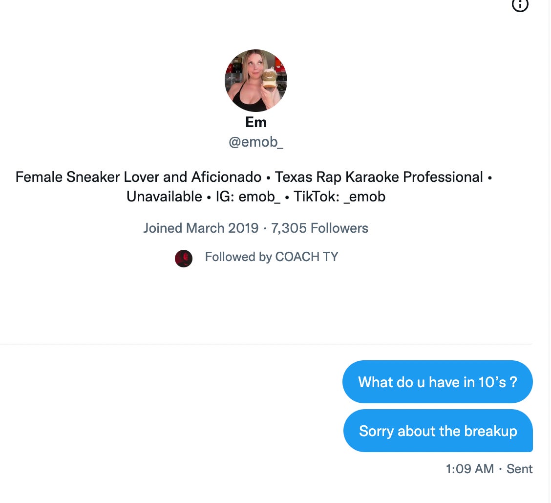 Meet Em . By the looks of it, just a normal Twitter user on the bird who describes herself as " Female Sneaker Lover and Aficionado • Texas Rap Karaoke Professional" in her bio.