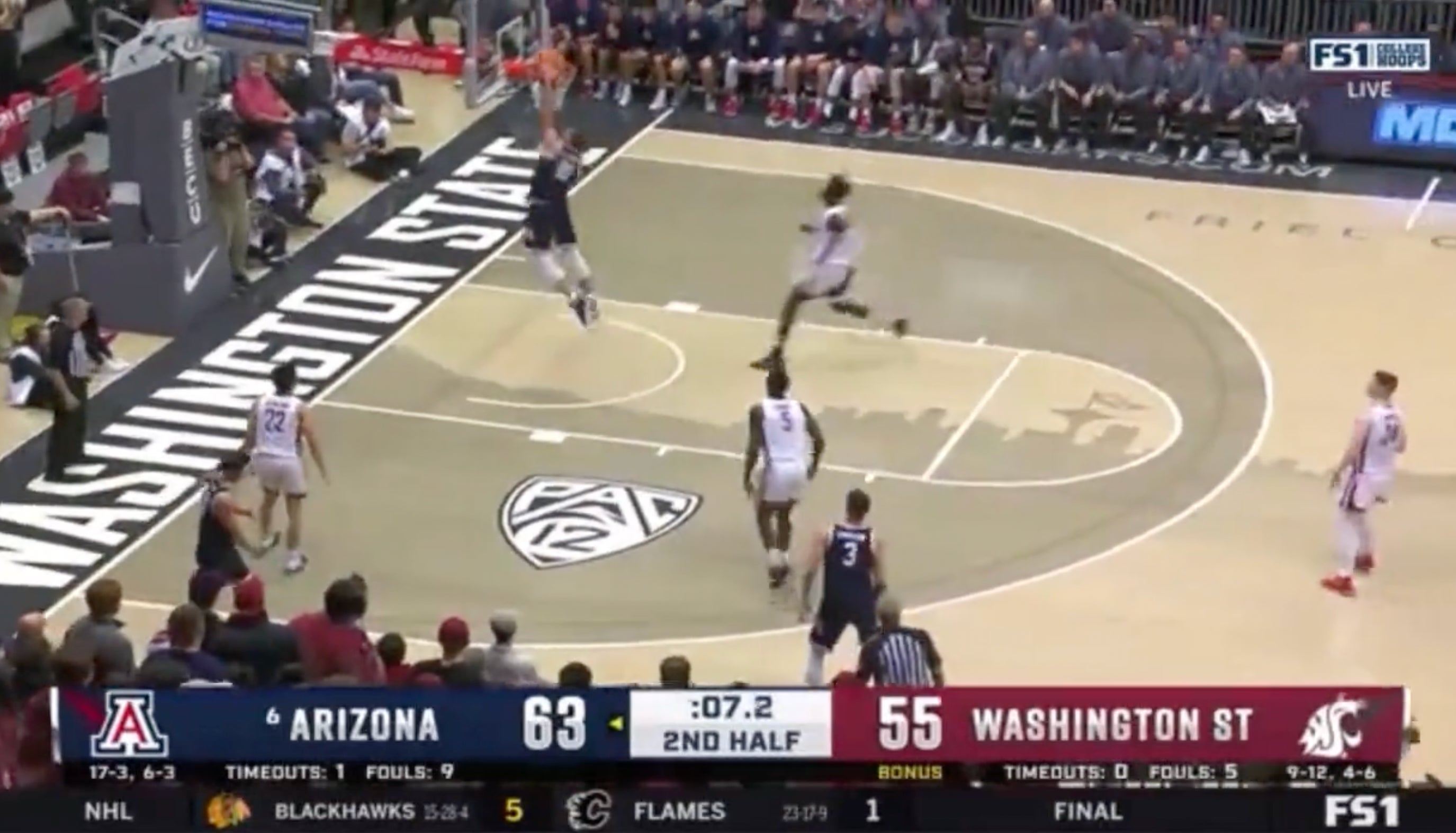 After a missed layup by Wazzu, Arizona dribbled down the shot clock and lobbed an alley oop towards the rim, except the guy heading down the baseline didn't expect it. The ball ricocheted off the backboard to a hustling Cougar who proceeded to cash in on some free points on the other end, trimming the lead to 8 with 18.3 to go. Timeout Arizona. Alright what's gonna happen next? A token press by Washington State only to have Arizona dribble out the clock once they cross the half court line, right? RIGHT??? Wazzu all but likely isn't fouling so as long as you avoid the turnover you're fine. All you needed was them to dribble the clock out and it's over.