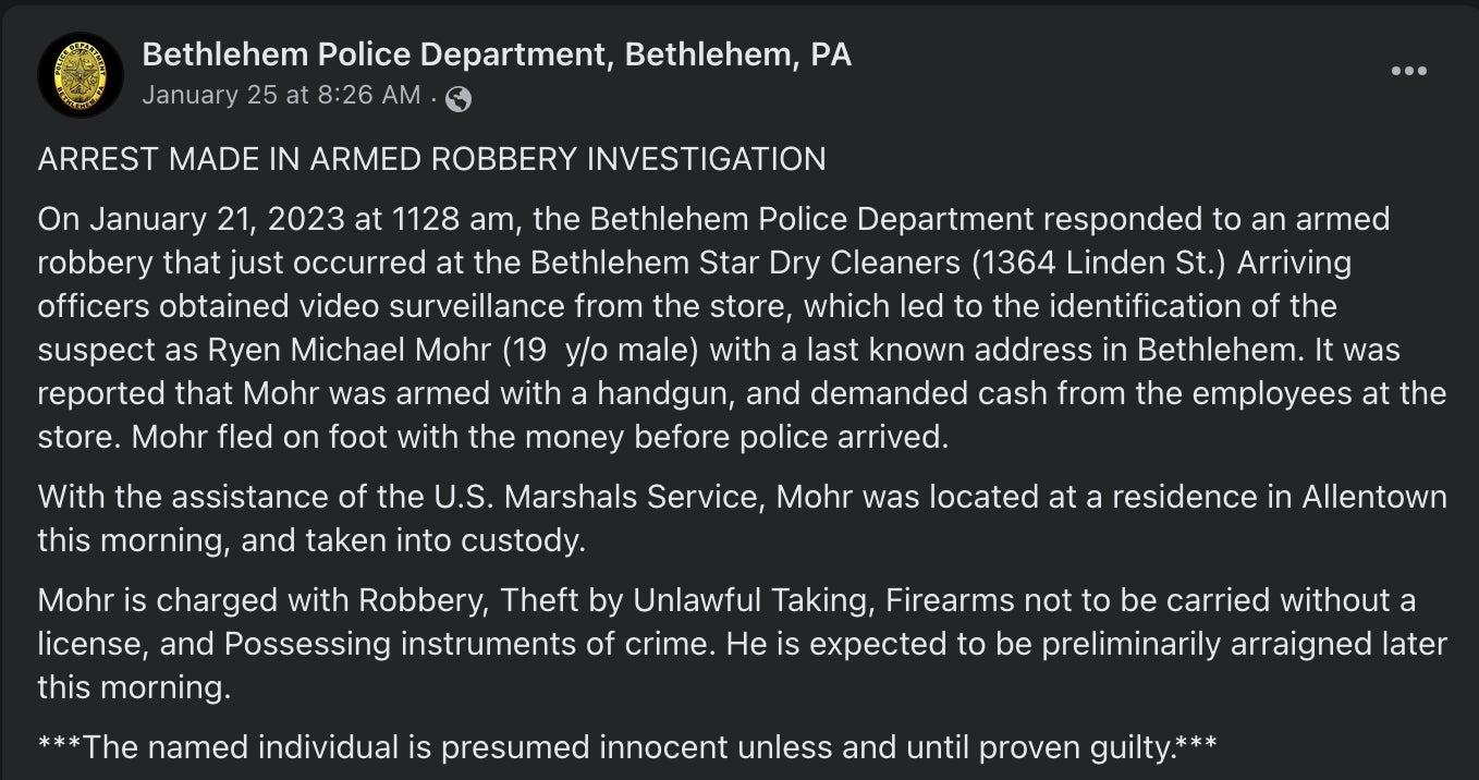 This style of post has become commonplace for local police departments. Cities like Bethlehem with less than 100,000 residents often post local crimes to their Facebook page so people in the area know what is going on or can help solve them. Sometimes the citizens also help dole out the punishments, which is exactly what happened here. Not only is buddy going to jail but he's also getting roasted for his Yosemite Sam ass pistol, Pete Weber ass kicks, and that ET lookin ass wrist.