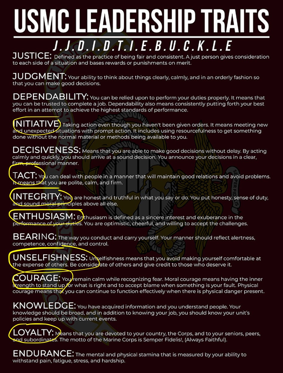Sgt. Vasquez exemplified at least 7 of the 14 USMC leadership traits in our simple JJ DID TIE BUCKLE acronym: The initiative to take action with this cameo and not just await his fate, tact with both the Island Boys and his command through clear communication, enthusiasm for the Corps & wanting to remain in it, unselfishness because those cameos cost $80, courage knowing full well this could go terribly wrong and turn you into an example the Corps uses forever, and loyalty in taking that risk to remain an active Marine.