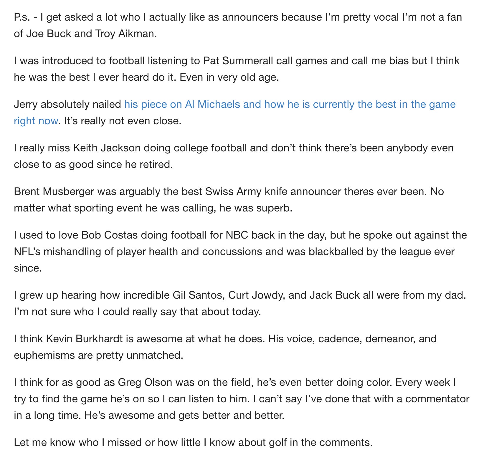 Sure, maybe he has been mailing in his research during the week, showing up on Sunday unprepared. Maybe he can't stand Jim Nantz's fuckin guts and loathes having to pretend they love each other for 4 hours every Sunday afternoon? Who knows. All I know is there's bigger fish to worry about, who are much worse at their job.