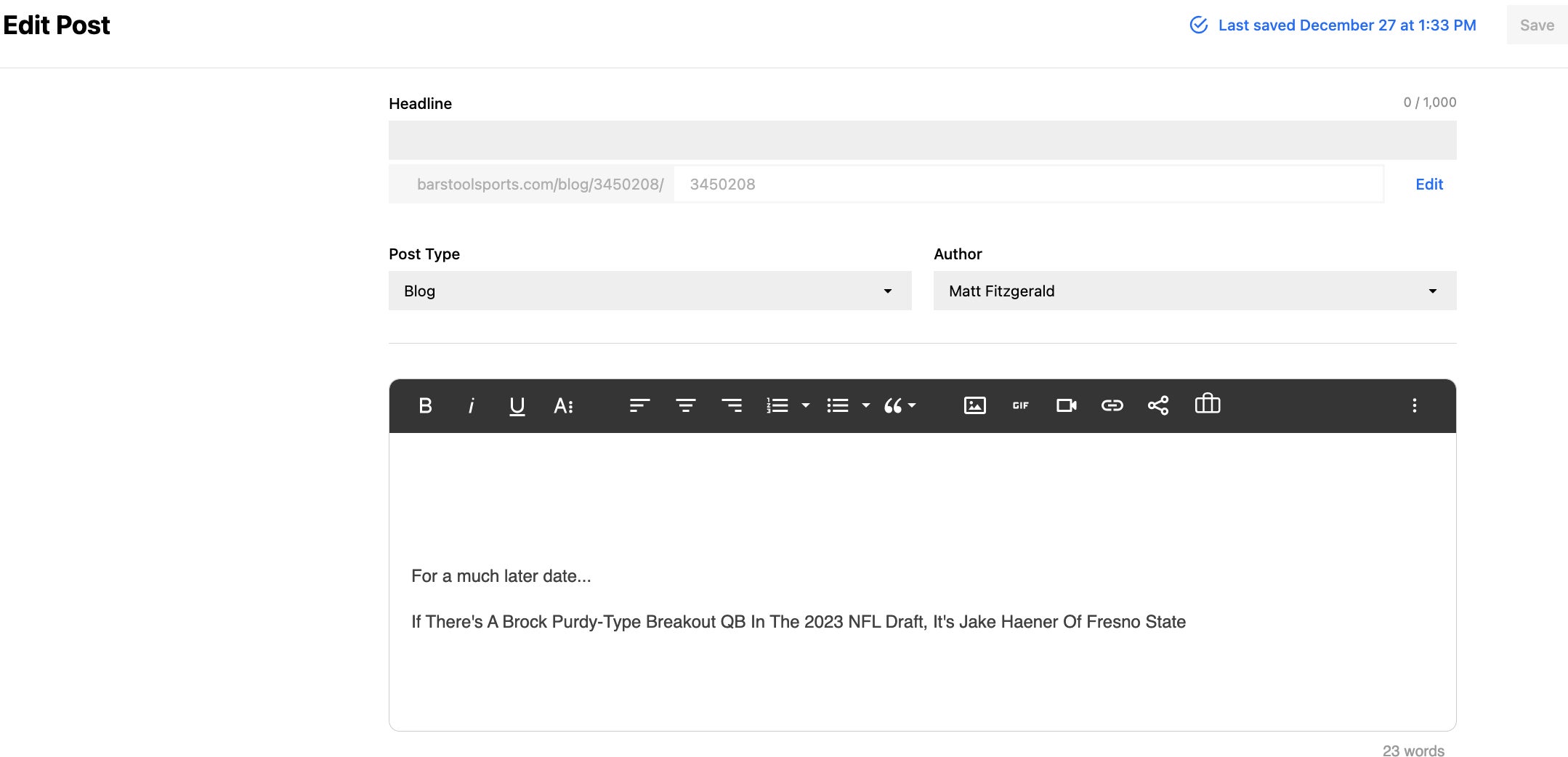 LOL that sounds like someone I don't wanna mess with. If you're a moderately quarterback-needy fan base and you're sitting there on late Day 2/early Day 3 of the draft, Jake Haener is the guy you take a flier on. He stands out to me so much more than any of the other so-called second-tier quarterbacks, and as the kids say these days, Haener got that Fresno [bull]dog in him.