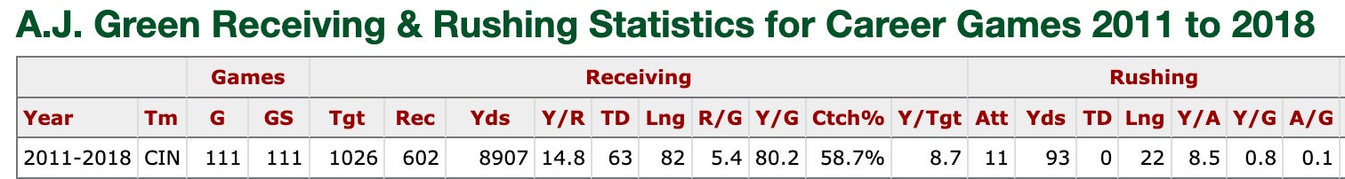PS Adriel Jeremiah Green is still the most fun name to say out loud in the English language. It's science. Anyway, the dude started off with seven 1,000-yard receiving campaigns and had Andy Dalton as his QB the entire time, save for a brief cameo by AJ McCarron.