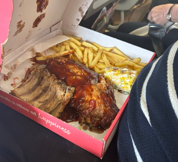 If the ribs are individually sliced and didn't have an entire bottle of bbq sauce mindlessly squirted onto them, then ribs can be both dangerously delicious and relatively mess-free. Which seems like a good combination for in-flight dining.