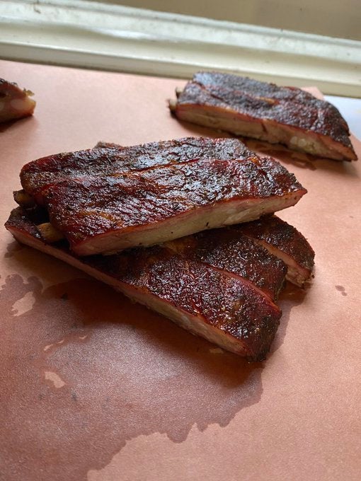 I can understand being slightly repulsed by the sight of these on a plane. I'm sure the smell is still perfectly acceptable. But we've got no bark developed on those ribs, they're over-slathered in the most default looking BBQ sauce you could have, and I've also always just hated the idea of serving ribs a full half-rack at a time. Ribs are an exponentially less messy endeavor if you just take the time to slice every rib individually before serving. Like so: