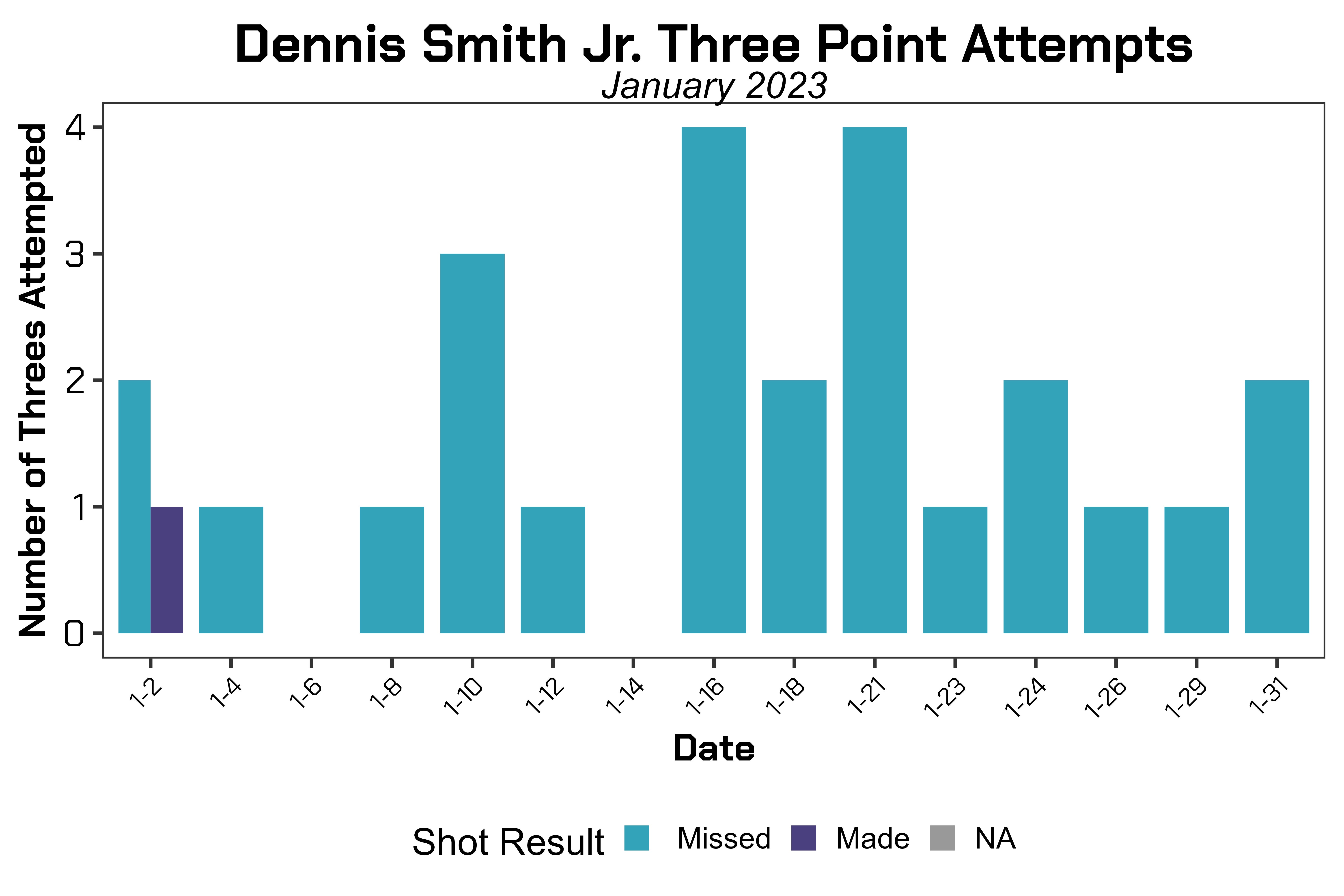 So glad you asked because the answer is no. I'm here to defend the honor of Dennis Smith Jr. of the Charlotte Hornets who took 26 three point attempts in the month of January and went a gentlemen's 1/26. His make came in the first game of the new year which was followed by 23 consecutive misses - the most of anyone so far this season across multiple games. But I'm not here to bring up the 23-consecutive misses part. I'm here to remind everyone that he at least made one in January, so there's no reason to poke any fun. Here's the breakdown in graph form. Big miss by Miami not trading for this guy. Talk about a culture fit.