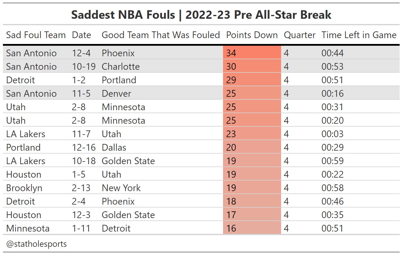 Only the Spurs have committed a sad personal foul while down 30. I'm defining this as any personal foul on defense (to presumably stop the clock) in the final minute of a game when a team has no chance to comeback to win. The Spurs did this on October 19th and decided to run it back in December down 34. In fact, three out of the saddest four fouls in the league so far belong to San Antonio. Hang it.