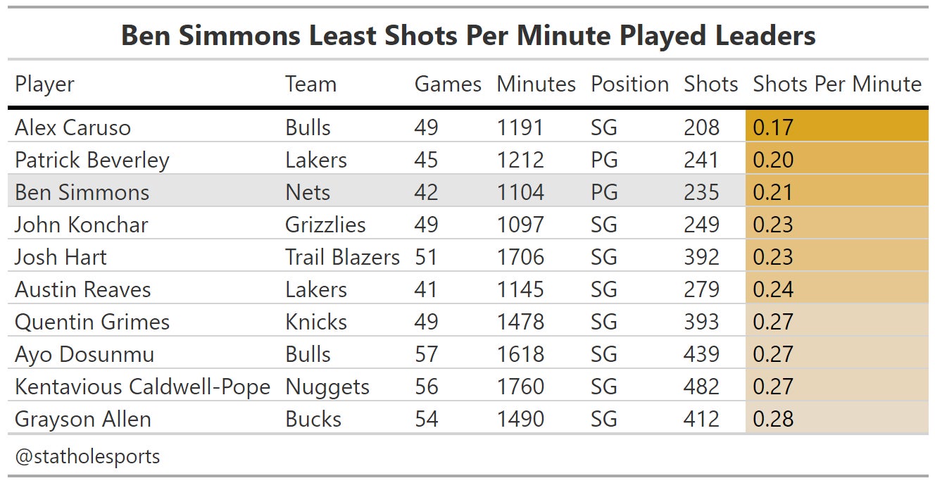 OK, so the Ben Simmons challenge is having the lowest percentage of shots taken per minute played for any shooting guard with at least 1,000 minutes played. Yeah, I just made that stat up on the fly. As you might know, Ben Simmons often times flat refuses to take a shot even when wide open and it's gotten so bad that even the broadcast crew of Nets games couldn't help but offer some advice to guide him in the right direction: