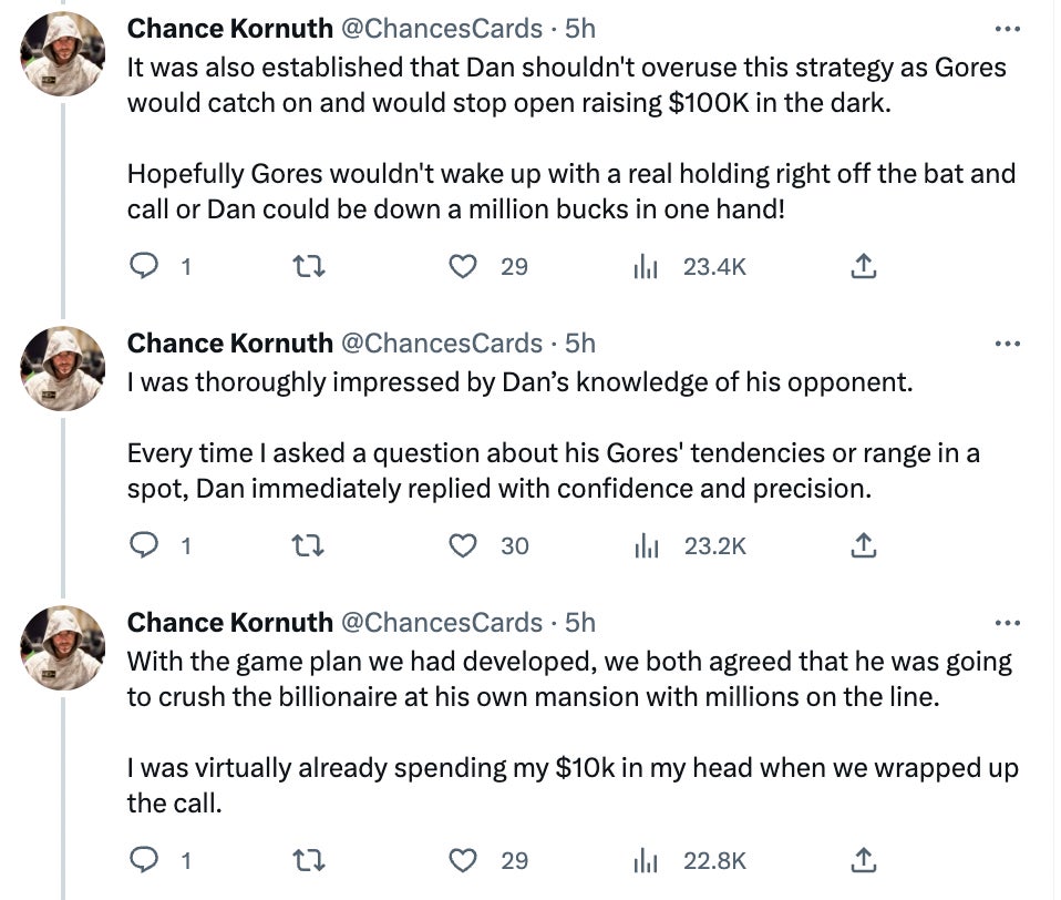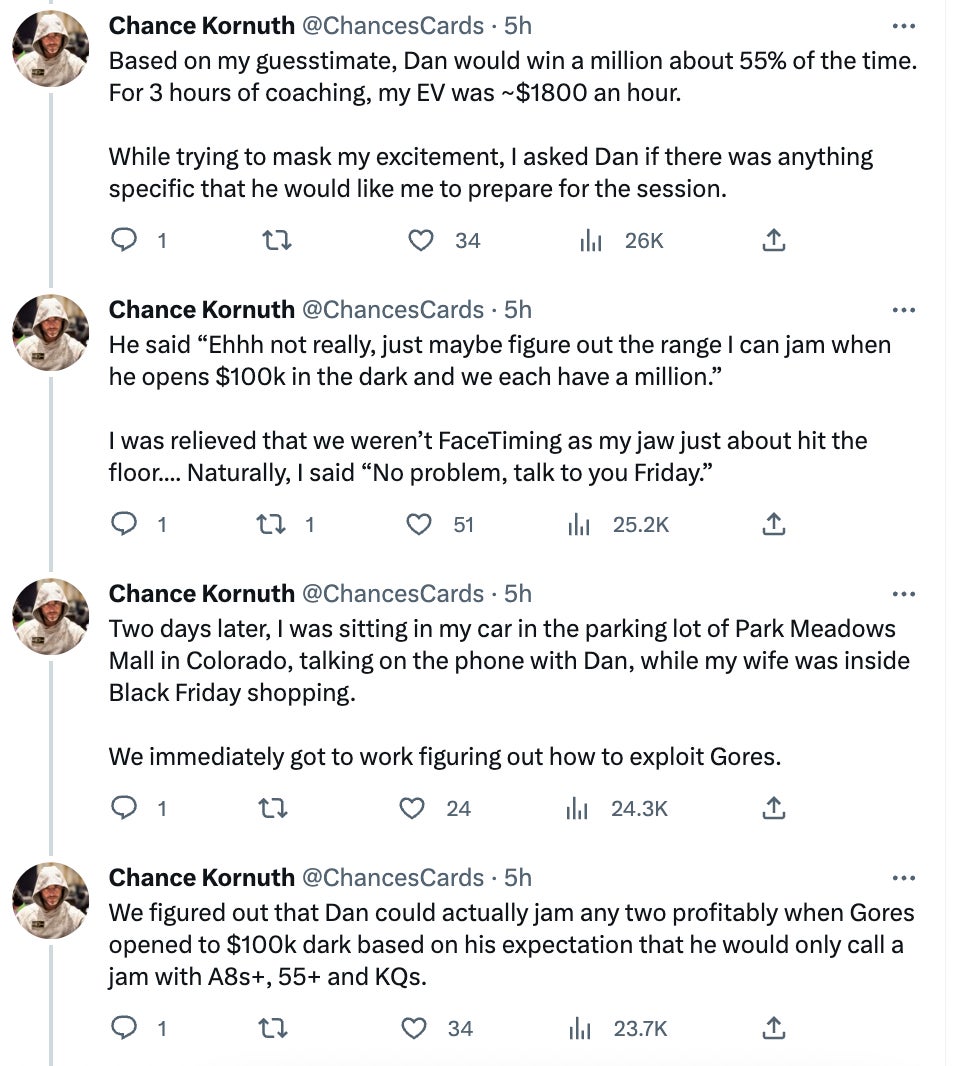 So back to Chance's story. Chance is an extremely good poker player. One of the best, to the point he was Bilzerian's coach for a $1 million heads up match vs a billionaire. Chance is also super reputable and well respected by everyone. He goes on...