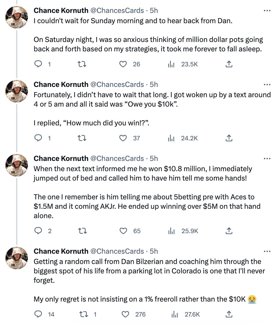 Chance was given a $10k free roll if Bilzerian won over a million dollars in the game. A pretty good hourly rate for a few hours of coaching, especially if you believe Dan is the better player, which clearly he was.
