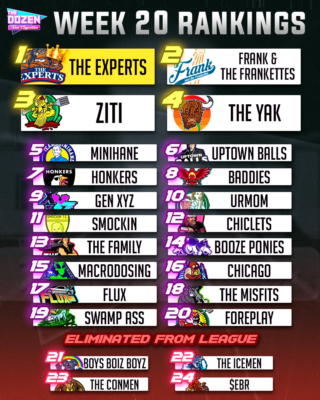 Week 20 of the Dozen is here. We got three teams ranked in the Bottom 5 (Chicago, Flux, Misfits), trying to take down three Top 4 teams (Ziti, Frankettes, Yak). The All-Star Game and Tournament are no longer far away. Some teams only have two to three more games left this season. Winning means more every week. Our correspondent Scoops L'Aguirre has the breakdown…