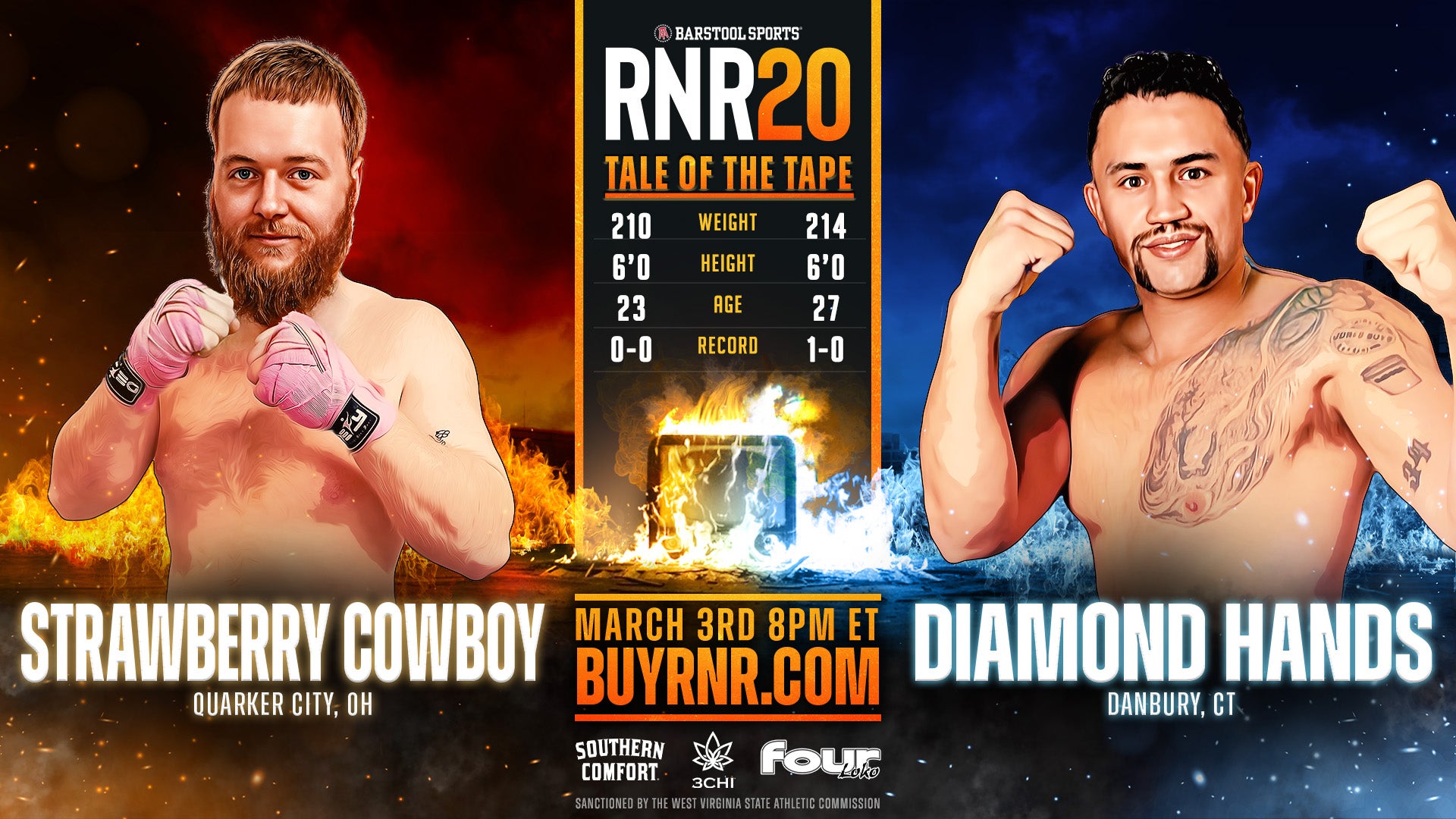 Diamond Hands still has to get by "The Strawberry Cowboy" first and it's no guarantee he will. I like his chances based off his pedigree, but the beauty of Rough N' Rowdy is you NEVER know what type of maniac is stepping in that squared circle. The Cowboy may be a tomato can or could be a street fighting knockout artist with a chip on his shoulder. Either way there's gonna be violence and plenty of it in this fight + our 20 other brawls this Friday night.