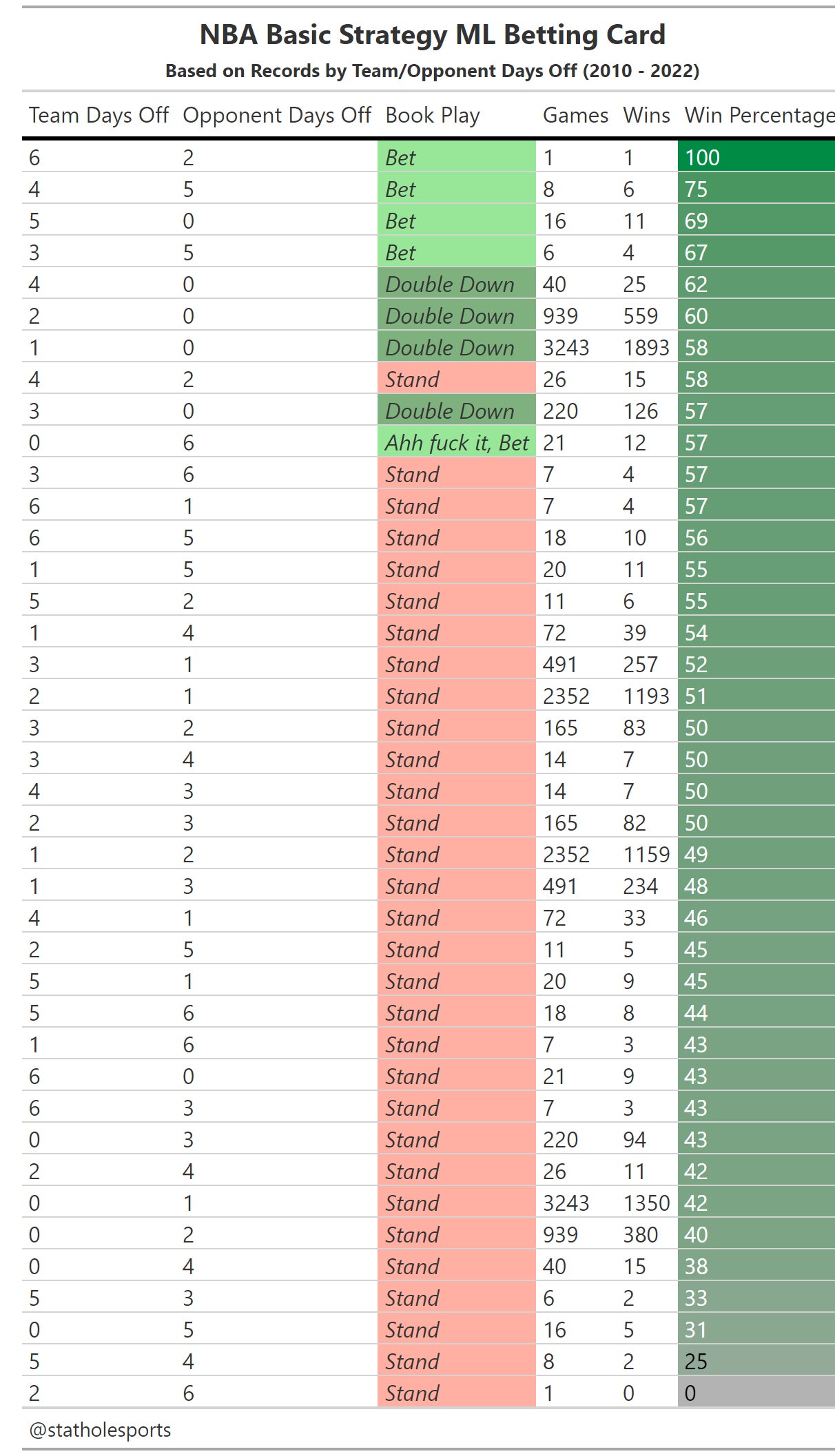 You know how they make those blackjack basic strategy cards for novices who look at it before standing on a 16 vs a face anyway? Well, I just created one for NBA moneyline betting based a simple hack that leverages load management on the team level. I'm pretty excited to test it out too because as a skilled data analyst there's nothing more exciting than tricking yourself into thinking you coded a way to beat Vegas. It's pretty simple too. No, not the tricking yourself into thinking you can beat Vegas part. Well yes, that too. But I mean the scheme I concocted. All you have to do is consider the number of days off for a particular team vs their opponent and run success rates on each as shown on the card.