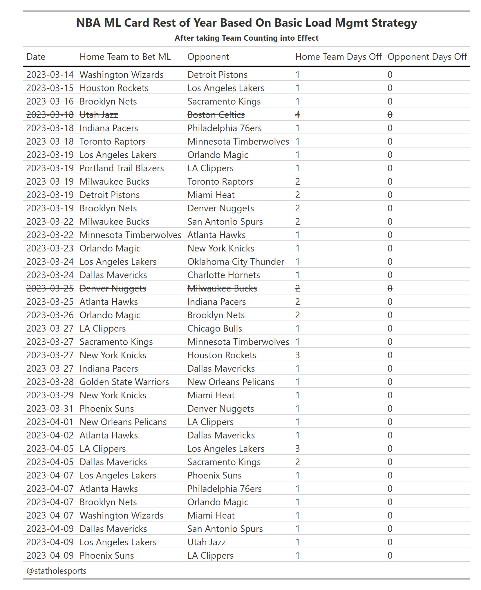 I don't have historical money lines at the ready to test out if this would have been profitable, but my made up Law of Shrodinger's Stat says if you don't look for the answer, you'll never be wrong. I'd rather have some fun and play this out (responsibly) full well knowing it'll take a miracle. I've never seen anyone take the work to map this out as I did so who knows? If you're with me, here's all the qualifying teams to bet on rest of season adjusted for home teams only and the genius "Rain Man" idea of not betting against the Celtics or Bucks taken into account.