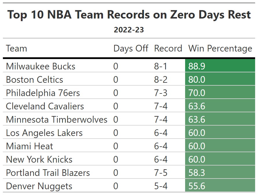 To clarify what's going on with the basic strategy card, I tracked how many days of rest each team had vs their opponent for every game since 2010. The card shows the win percentage for each relevant combo and my ruling of whether or not to bet it. I basically decided this based on a combo of sample size and percentage close enough to hopefully beat the vig. But as any blackjack player knows, basic strategy doesn't do enough to give you an edge. We still need to find a way to "count cards" via NBA style. You'll notice the card is pretty much telling us to bet against teams with zero days rest. The only exception to this is if a team has six days rest vs a team with zero. Apparently teams forget how to play after six days of rest, but who cares because that barely ever happens. What we need to know is which teams are immune to load management. Hopefully this will drive our Rain Man basic strategy deviation that might put us over the edge of the house vig. Here's the top-ten winningest teams with zero days rest this season: