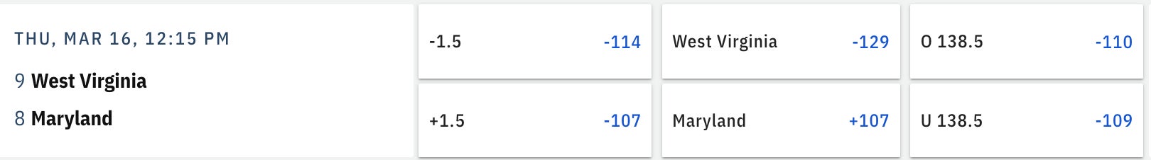 I was going to go with the over in Mizzou/Utah State, but we're sticking with sides here. The first reason I'm taking WVU? Maryland hasn't been great away from home. Their wins on neutral/road courts are: Miami (good), St. Louis (average), Louisville (historically bad), Minnesota x2 (really bad). That's it. Now you have a WVU team that will try to get after Jahmir Young and can throw a couple guys on Scott. I like the matchup and I think the Big 12 is loaded so WVU is a little undervalued.