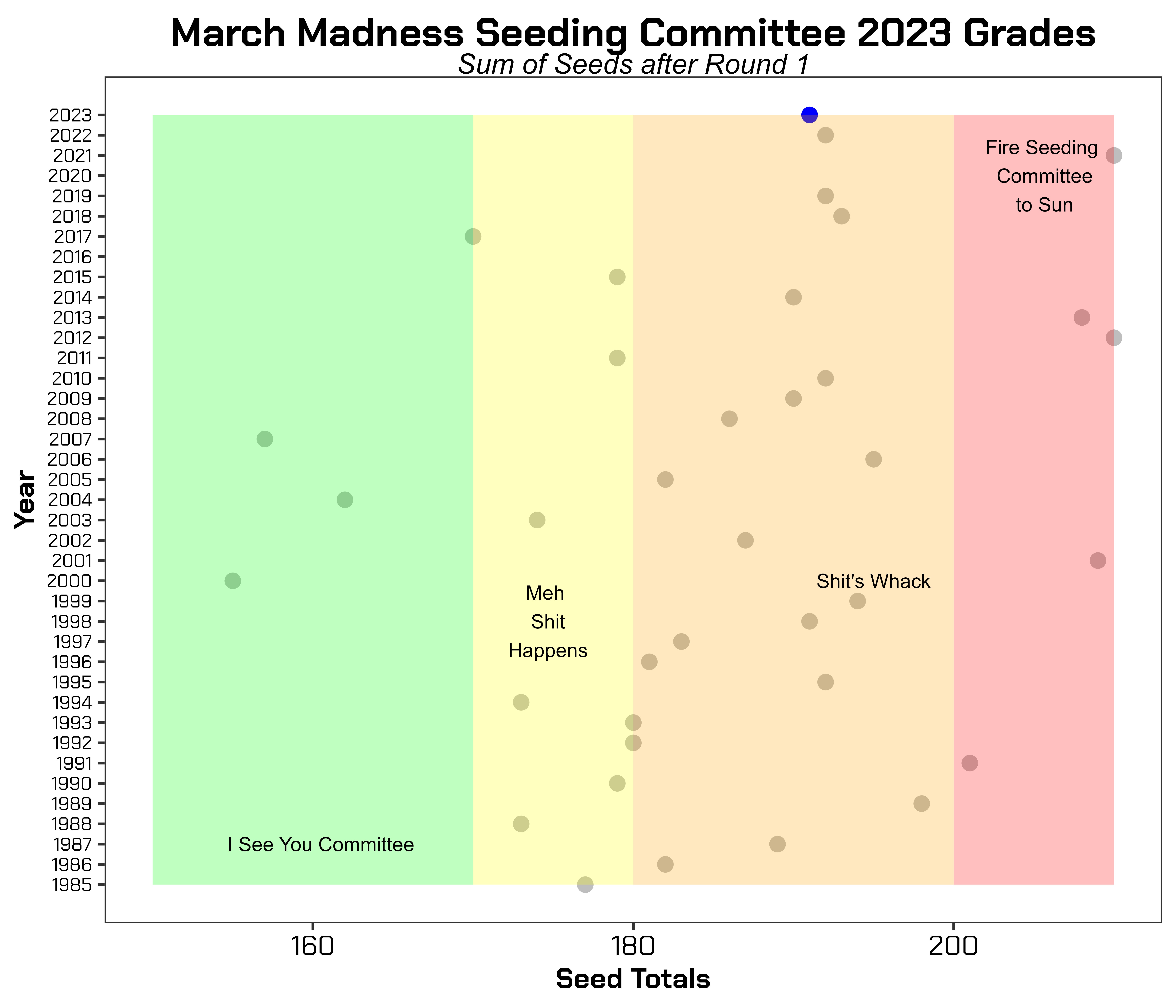 The blue dot for this season falls firms into a "meh shit happens" grade which is actually a bit surprising seeing as two #1 seeds have already bit the dust. Had FDU pulled through we'd be in "shit's whack", but that didn't happen so credit where credit is due. If Purdue hadn't Purdidn't and instead Purdid, we'd be right into the green "I See You Committee" grade. Even so, there was still a lot of madness going on which is a good reminder to us all that even when the Selection Committee is doing a decent job, the madness and the chaos still thrives. That makes the 2021 result all the more insane. This was the year that UCLA made the Final Four as an 11 seed with Loyola (8), Oregon State (12), Syracuse (11), and ORAL ROBERT (15) also making it to the Sweet 16. More than fair to blame the effects of COVID wiping out 2020 on all of this but that was still a absolute wild one.