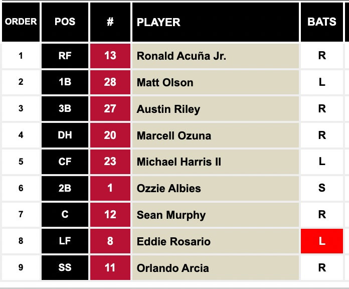 The Braves boast one of the best lineups in the game. I said yesterday that the Blue Jays 1-9 is so unforgiving that it's tough to top and they still probably have Atlanta here, but man is this a consistent bunch. You don't have a fun time as a pitcher facing these men.