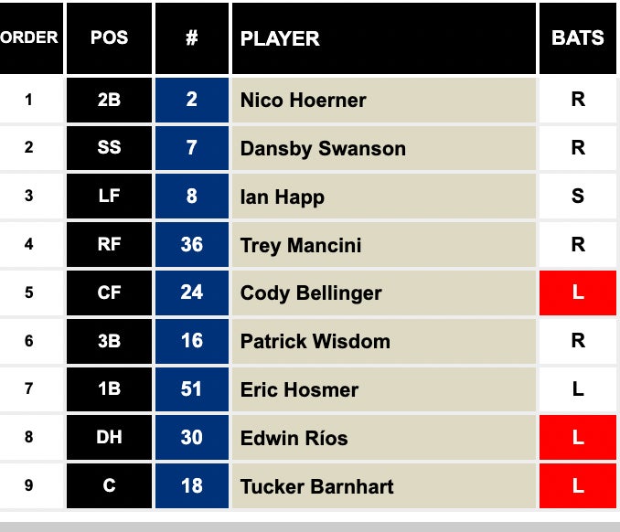 That's a lineup alright. Is it any good? For sure not, but at least fans buy tickets to the games and now who is at the plate. Hosmer, Bellinger, Mancini, Happ, Swanson are all guys casual fans are going to recognize and maybe pay to see. Can't imagine there was any other plan here other than that. I could definitely see that lineup tricking my brain a few times into betting them on a Friday afternoon when they're home and nothing else is going on. Dammit.