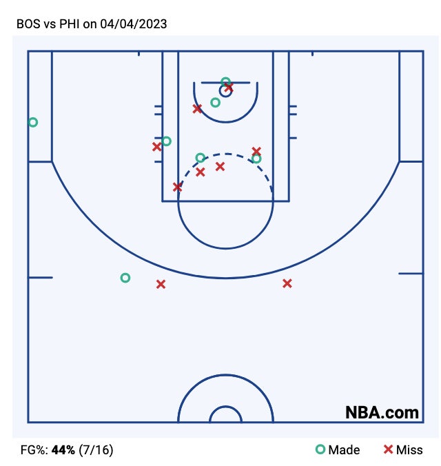 Embiid was 7 for 7 from the restricted area, 8 for 11 from the paint, 5-6 from midrange, and 0-1 from deep. That's ridiculous. Add in 12-13 from the line, and that was about as clear an MVP performance as you're going to see. The Celts didn't really have an effective approach at any point of the game.