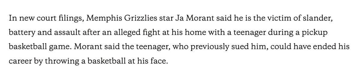 Had Ja not done that, he doesn't get suspended/removed from the team, and he plays more than 61 games. He had the production to be worthy of All NBA, but you can't seriously think that missing any of the three teams wasn't impacted by the decisions that JA MORANT himself made. To me, that video/decision was way more harmful than the other stuff being reported when it came to his All NBA chances. Whether you think that should be the case or not, completely avoiding your own actions and putting it all on a 17 year old who you (allegedly) punched and threatened with a gun is quite the move.