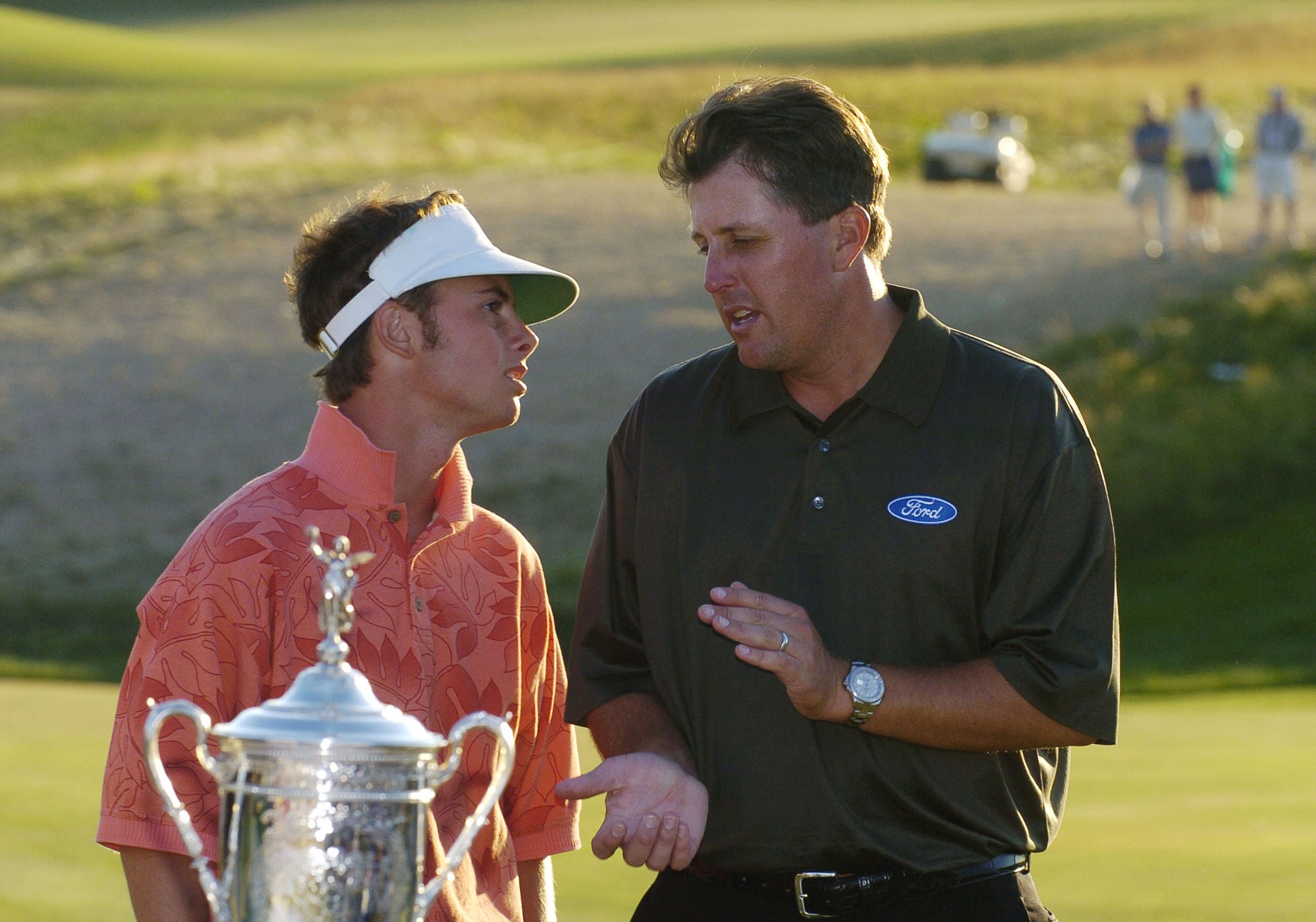 Levin has a bit of a cult-like following in the die-hardest golf fan circles, mostly because he has a fiery temper and he smokes cigarettes, and golf fans enjoy tantrums and have a weird obsession with golfers who smoke cigarettes. (He also made some headlines earlier this year for going with the Happy Gilmore putting style, which he still uses). Levin first popped onto our screens back in 2004 when he took low amateur at the U.S. Open at Shinnecock with a highly impressive T14, then posed for a picture alongside runner-up Phil Mickelson rocking a popped-up collar and a visor. The picture's kind of iconic.
