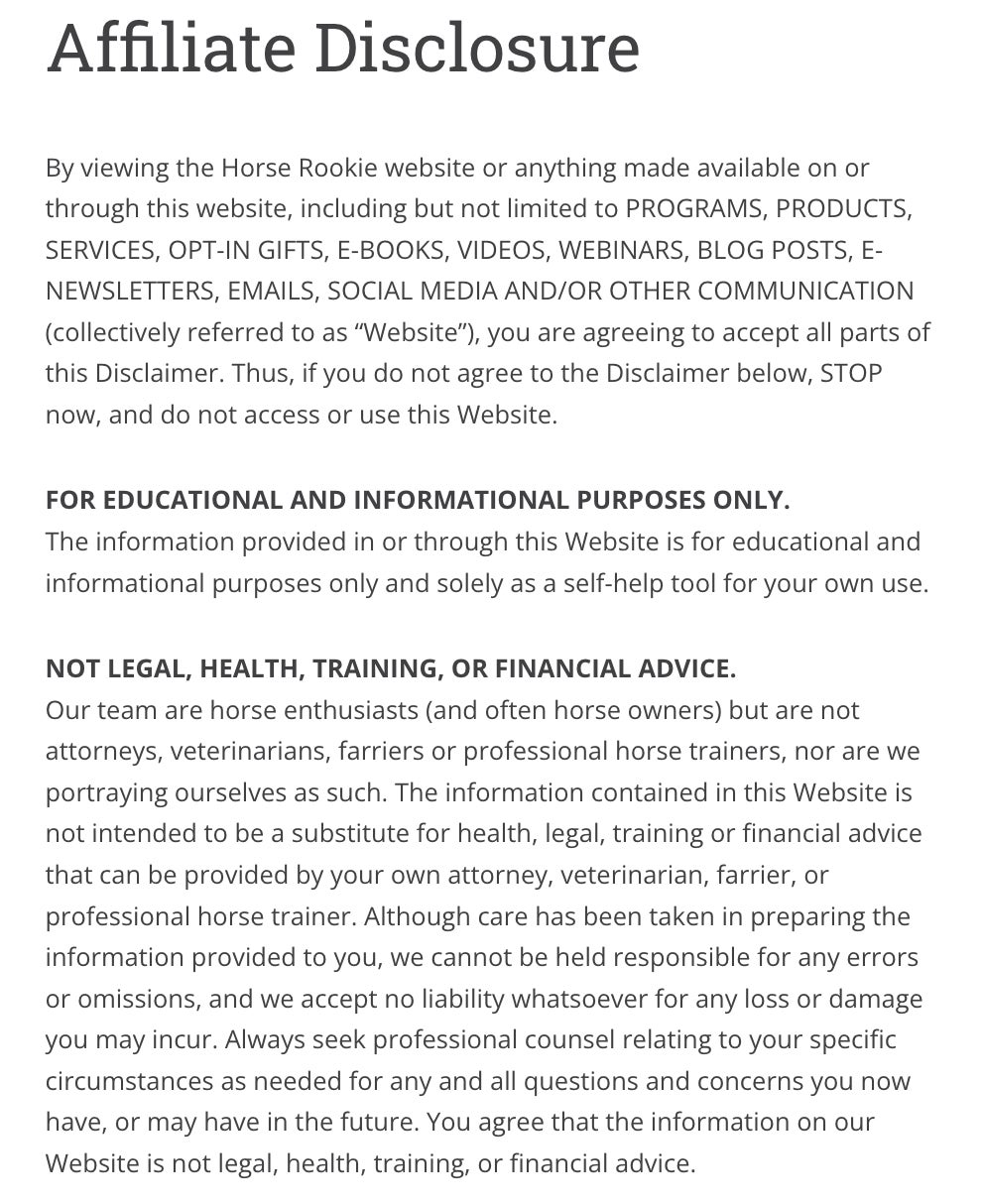 Our team are horse enthusiasts (and often horse owners) but are not attorneys, veterinarians, farriers or professional horse trainers, nor are we portraying ourselves as such. The information contained in this Website is not intended to be a substitute for health, legal, training or financial advice that can be provided by your own attorney, veterinarian, farrier, or professional horse trainer. Although care has been taken in preparing the information provided to you, we cannot be held responsible for any errors or omissions, and we accept no liability whatsoever for any loss or damage you may incur. Always seek professional counsel relating to your specific circumstances as needed for any and all questions and concerns you now have, or may have in the future. You agree that the information on our Website is not legal, health, training, or financial advice.