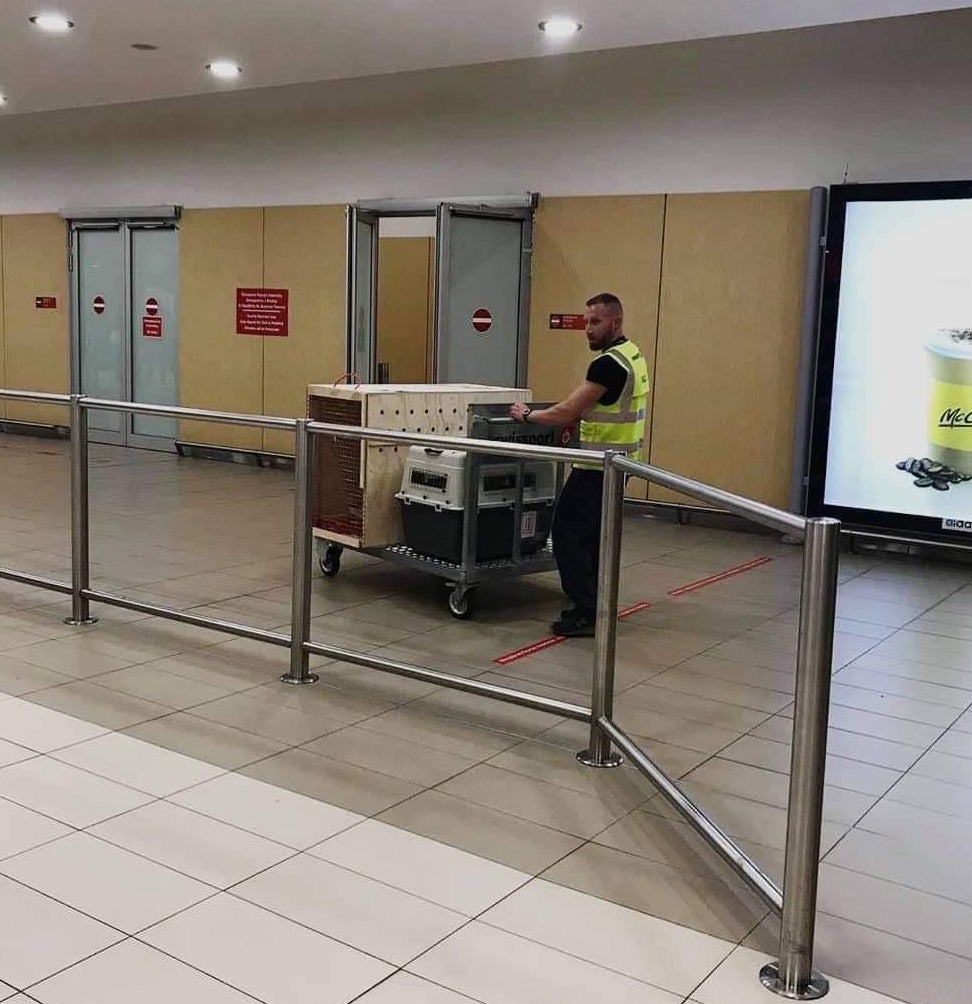 Then he sent me a pic of an airport employee wearing a high-viz vest, pushing a cart with two animal crates through the airport with the text, "She is not responding to us… We can't keep the dog in the crate…" I responded, "Then we have a problem…"
