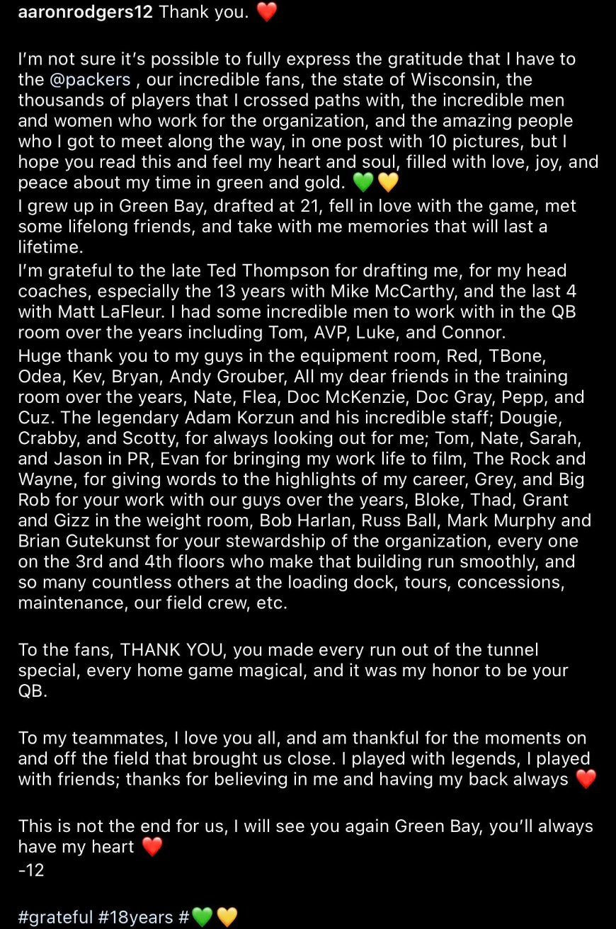 Not going to lie here, I was mostly fine and accepting of Aaron Rodgers moving onto the Jets, but that post kinda got me there. Pretty tough to say it much better than that. From thanking the late Ted Thompson, to naming the equipment room people, the training room guys, the nutrition man, his teammates, coaches, and the fans. Hell the man is still going on his IG story thanking people like their long time practice ref Larry Van Olstein and the team photographer Evan Siegle. Shit probably means the world to those guys to get signaled out. Maybe he did learn a thing or two from ol' Brett.